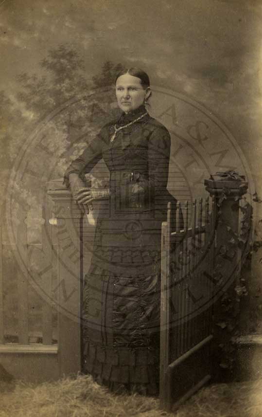 (Mrs.) Martha Anderson posed at open gate wearing high necked black dress and long gloves. n.d. b/w. gelatin emulsion. photo by G.A. Addison, photographer; Taylor, Texas. Old Picutes copied and enlarged. Life size crayon portraits a speciality. dealer in Frames, Albums, etc. 4.25 x 6.5" [some spotting]