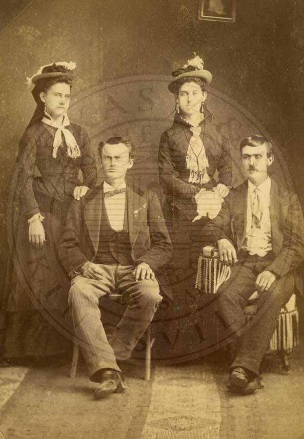 Betty and R.B. Masterson and Flora and Ben Owen. Men seated and wives standing to their right. n.d. photo by H.B. Hillyer; photo artist, Cor. of Avenue and Hickory St., Austin, Texas. brown tint. gelatin emulsion. [some fading] |