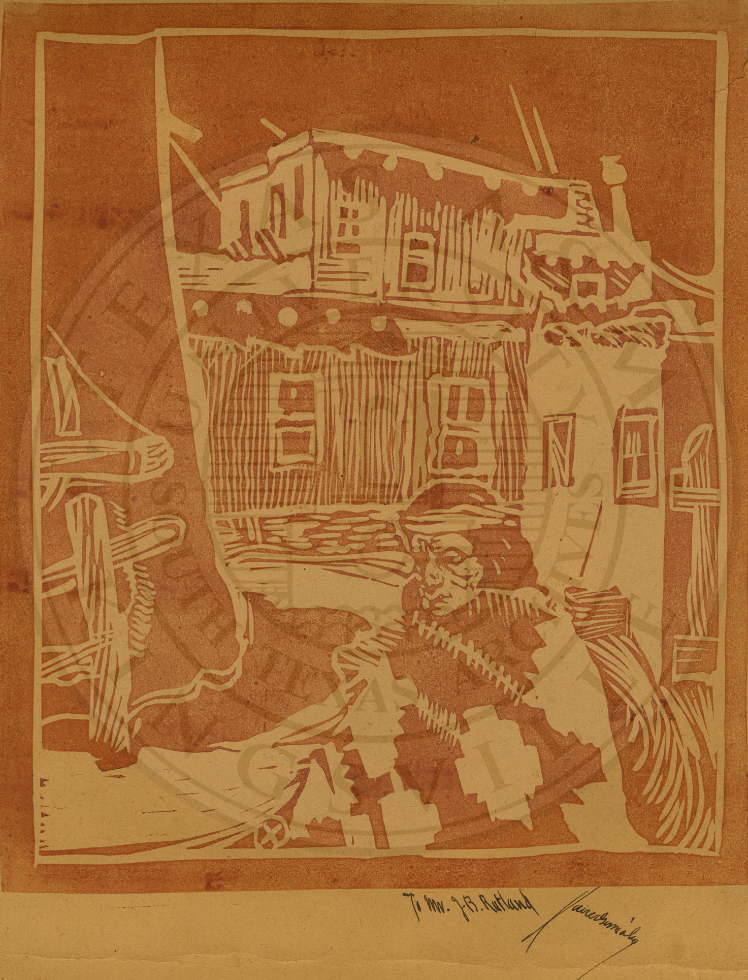 Native American standing infornt of building caption "To Mr. JB Rutland by Xavier Gonzalez. |