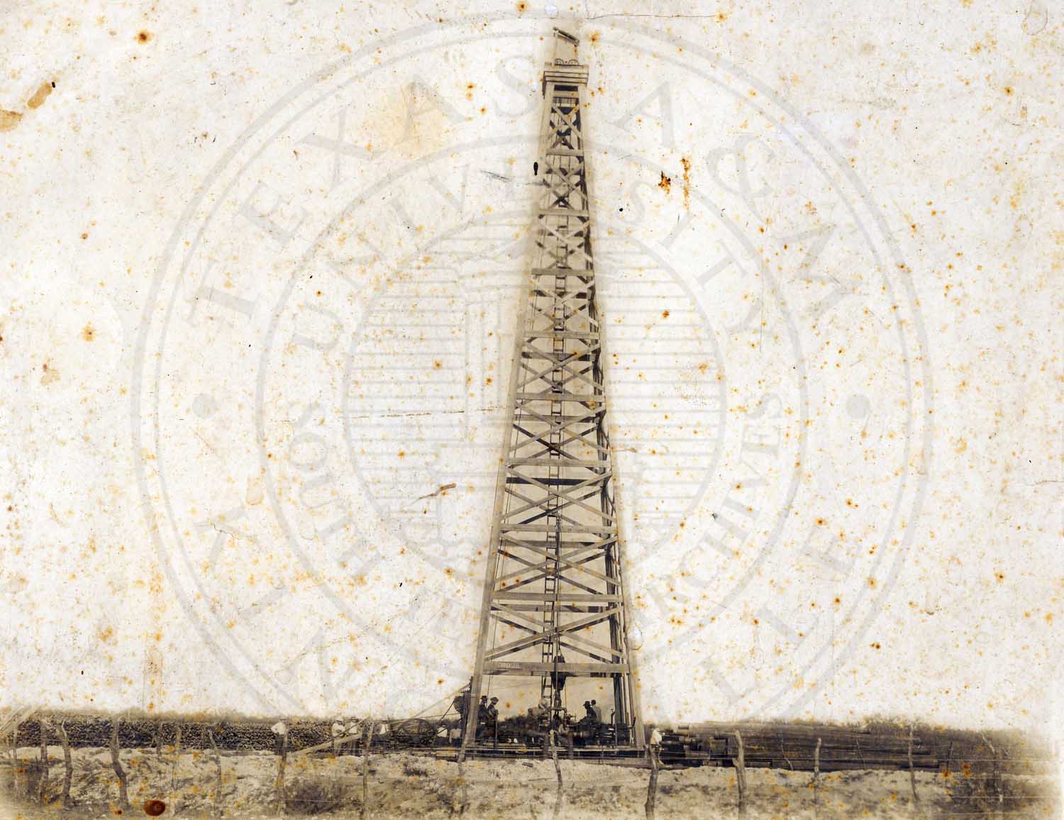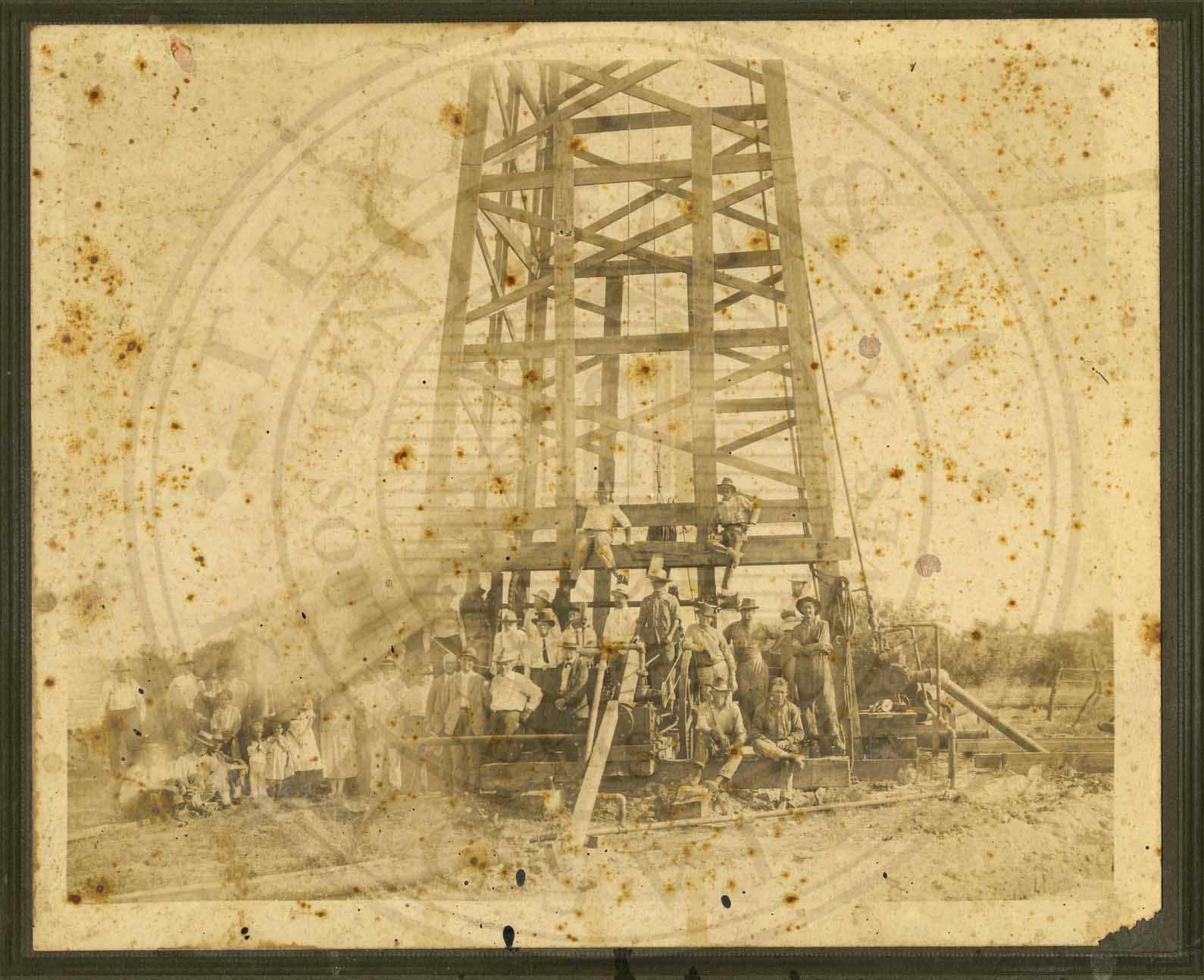 Matted sepia photo, 111/2”x131/2” of an oil derrick with a group of people posing for camera, circa 1930s-1940s |