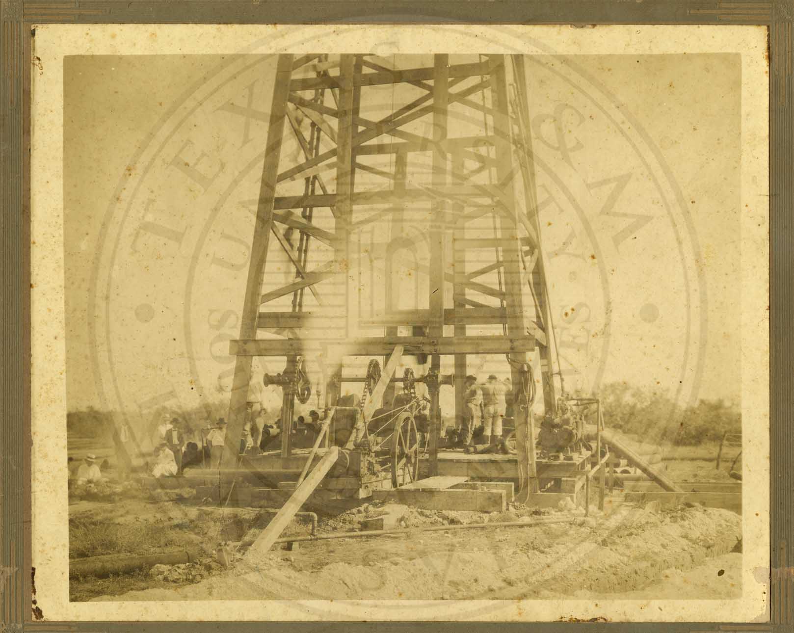 Matted sepia photo, 111/2”x131/2” of an oil derrick with a group of people working circa 1930s-1940s |