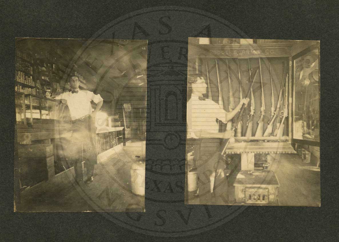 Photo of James Watson in front of guns in Lumber Yard Store.