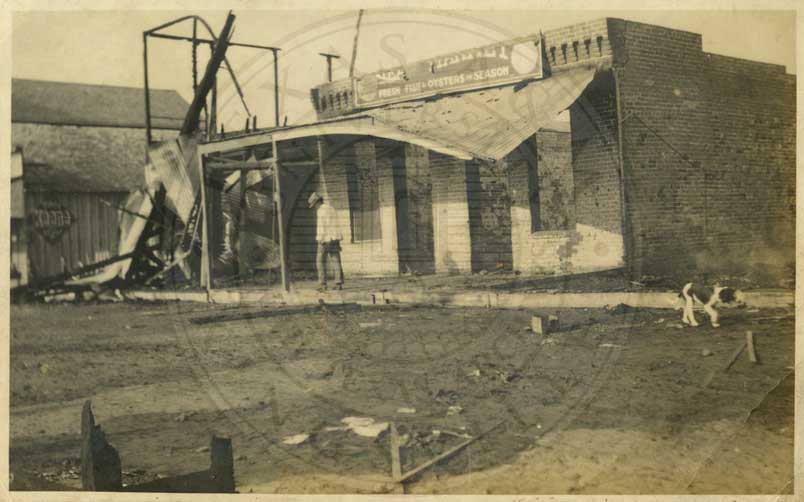 Photo of 5th street business district after fire in 1909, Edwards Grocery Store, Mrs. Duke in photo and other folks. |