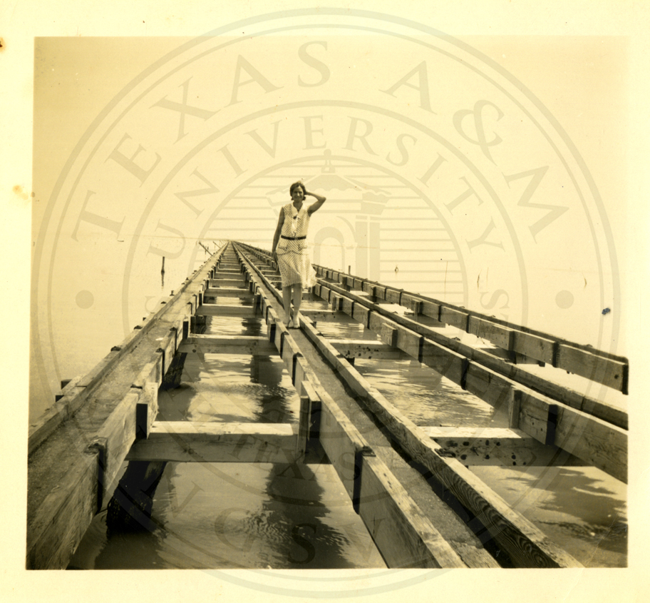Unidentified woman standing on a pier or birdge. Caption: "Corpus" |