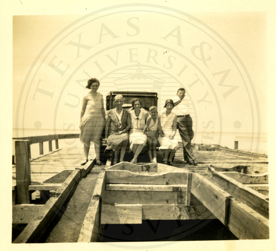 Four unidentified women, one unidentified man, and one unidentified boy seated on the back of a car or truck. One of the women and the man are standing on opposite sides. Caption: "Corpus" |