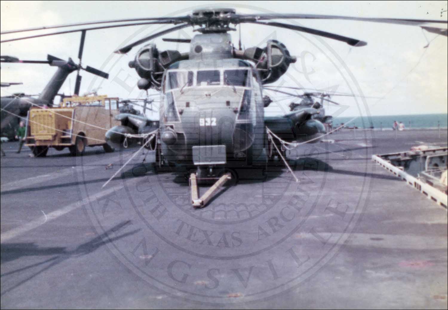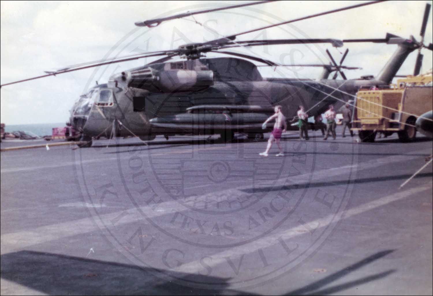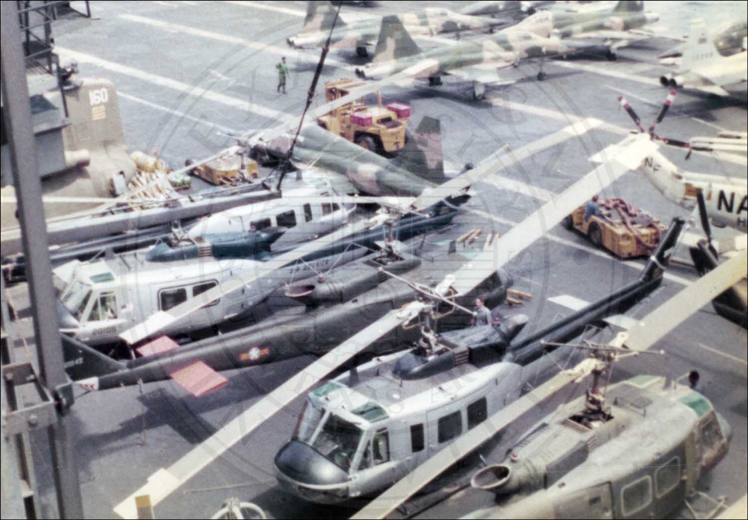 From the U.S.S. Midway Collection. 1975. The helicopters on the ship are Air Force helicopters. The helicopters came from an Air Base in Thailand. |