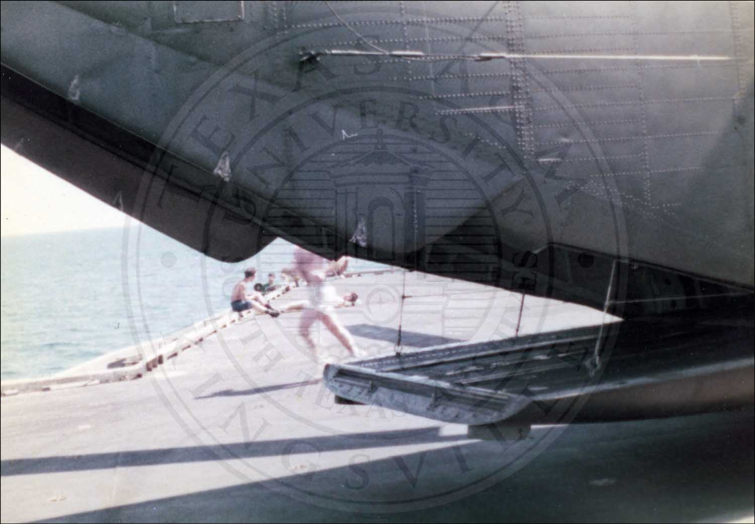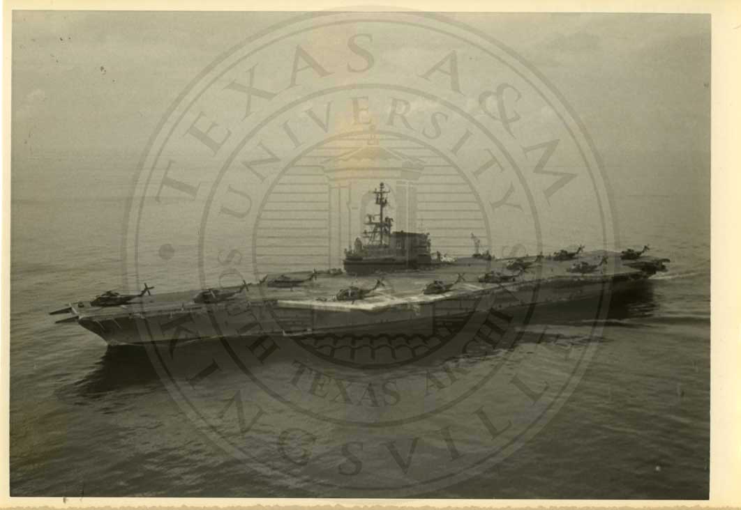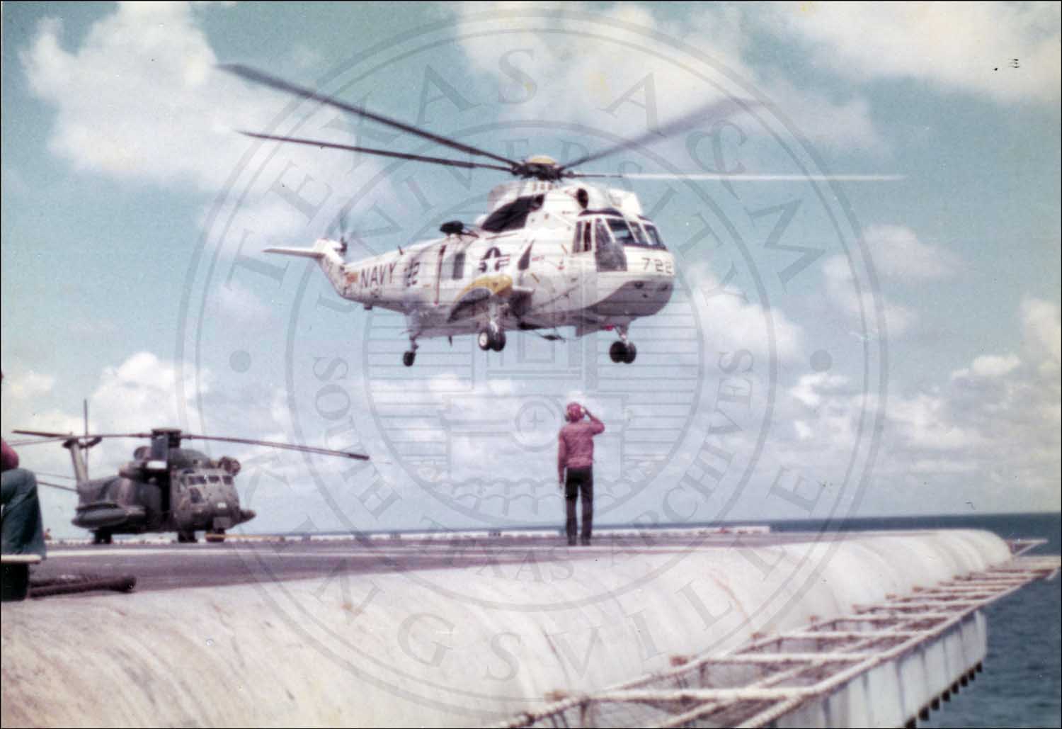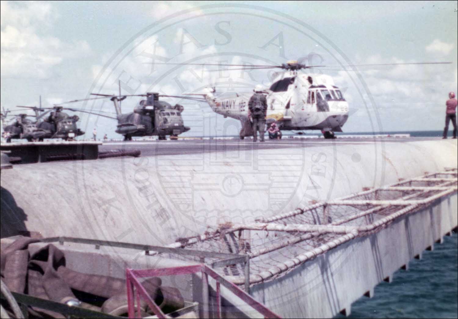 From the U.S.S. Midway Collection. 1975. The helicopters on the ship are Air Force helicopters. The helicopters came from an Air Base in Thailand. |