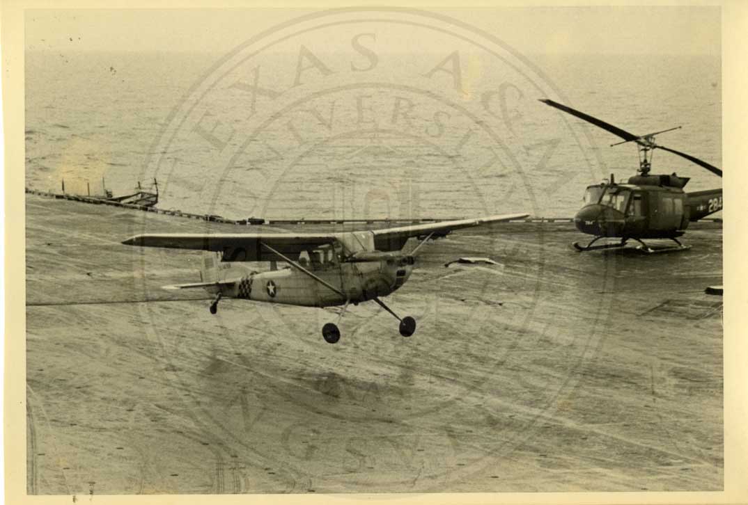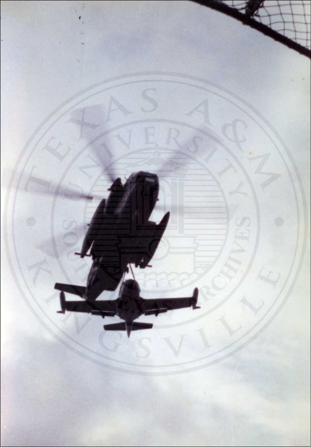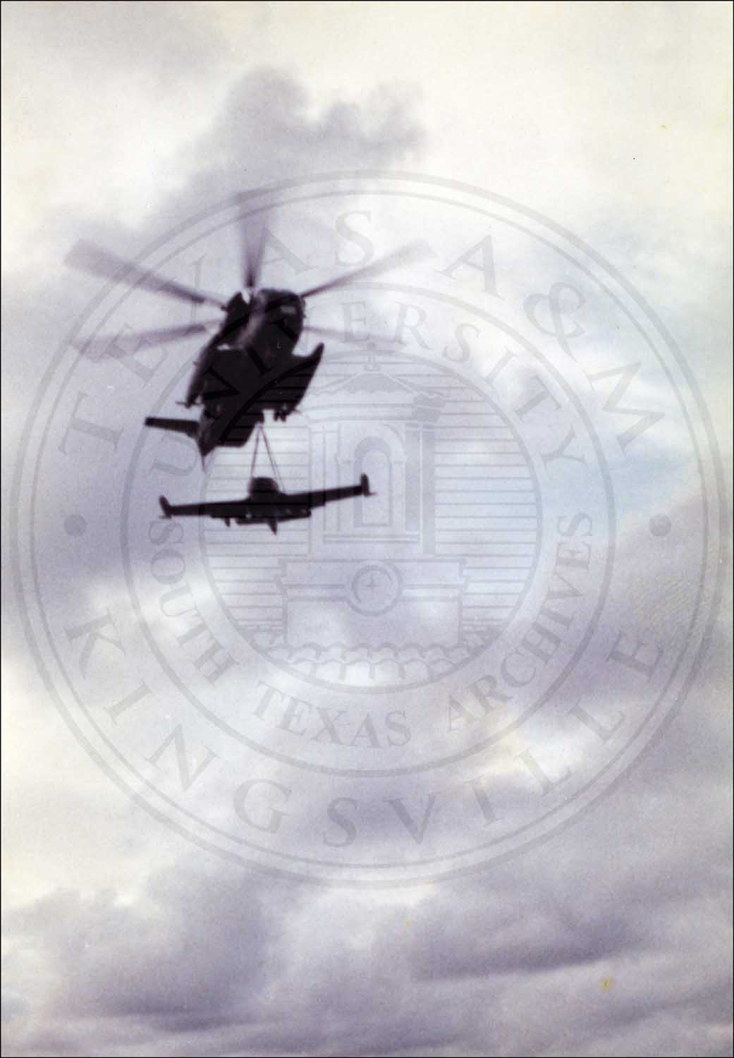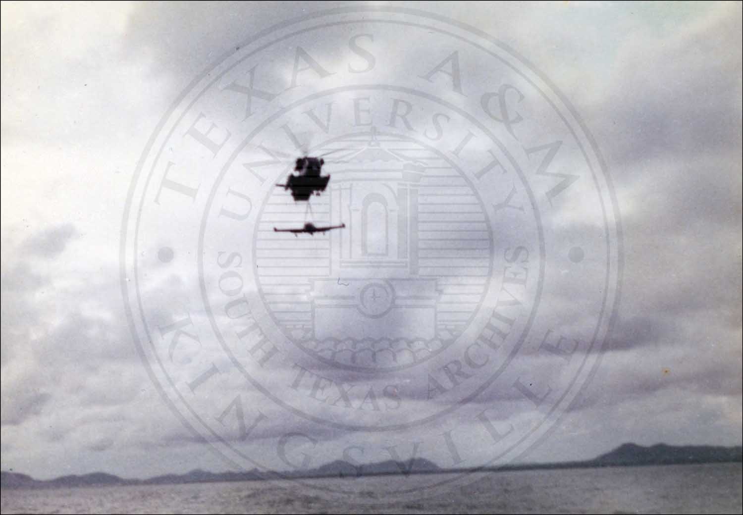 An Air Force helicopter carrying a plane (A-37). The helicopter had to drop it into the sea because it was going to crash. |