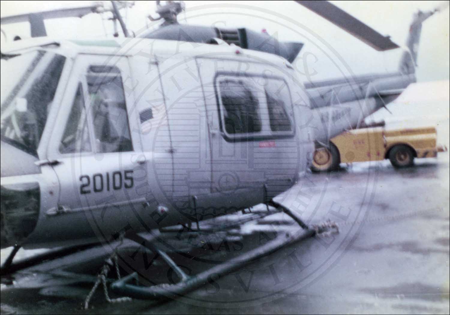 Unidentified males standing in front of a helicopter on the deck of the U.S.S. Midway. |