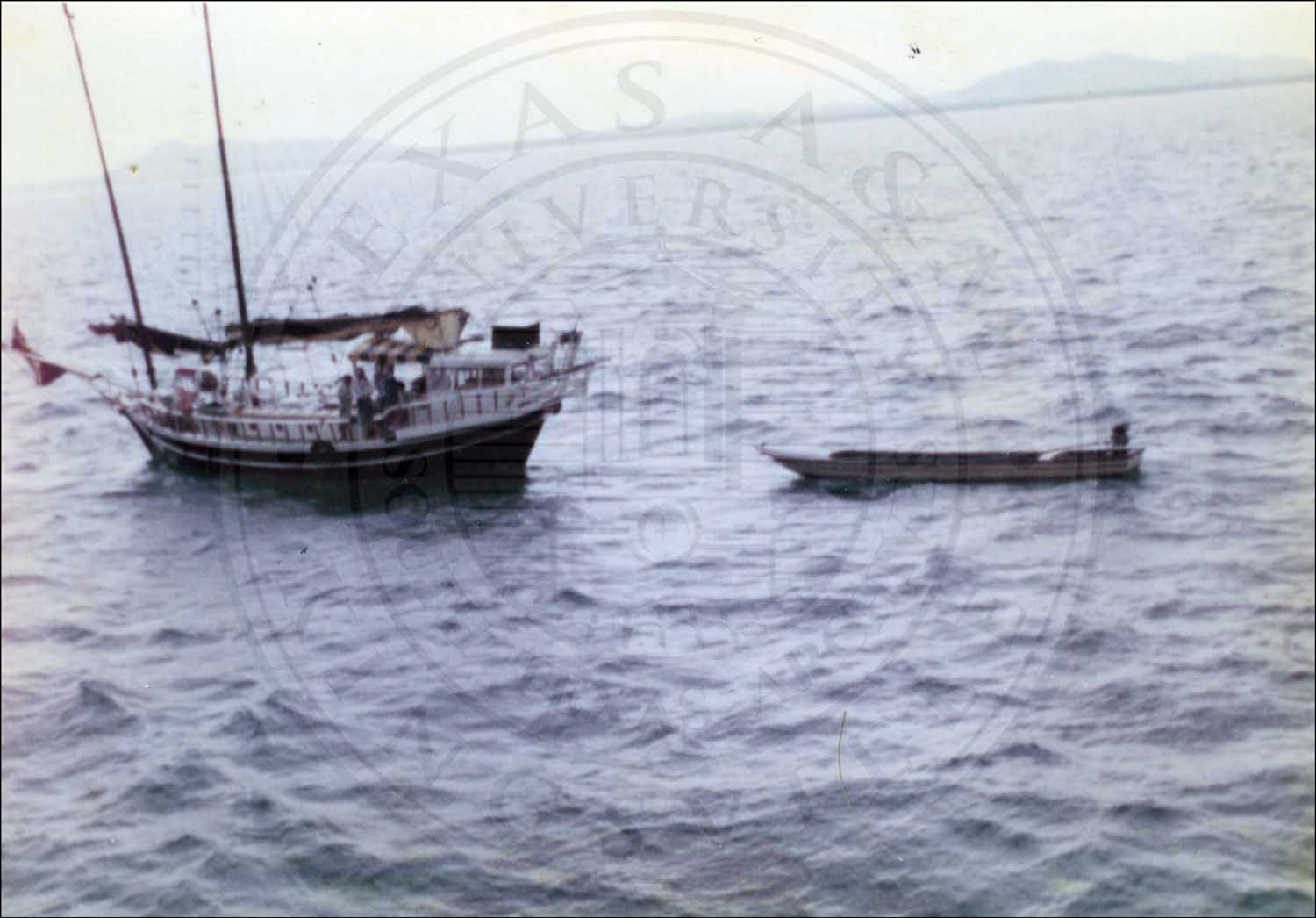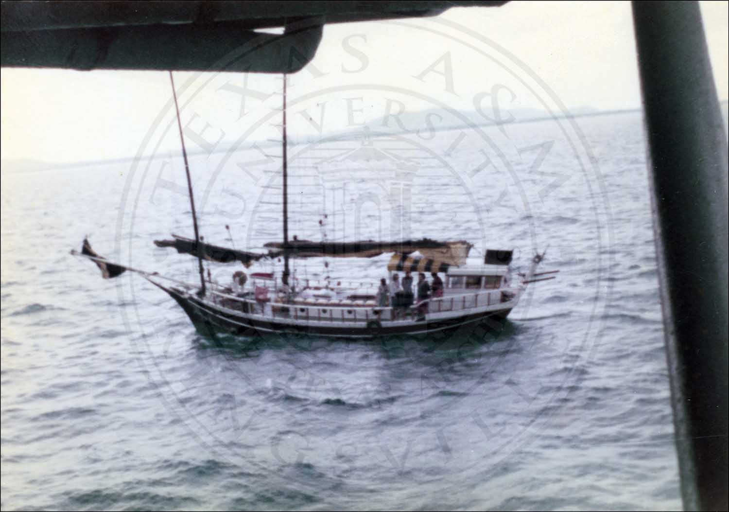 After the fall of Saigon, off the shore of Thailand. The boat in the picture is an example of the type of boat that would follow wanting asylum. 80 men, women and children were on this boat. It sunk after they got the people on the boat. They climbed up the ship on a boat net. |