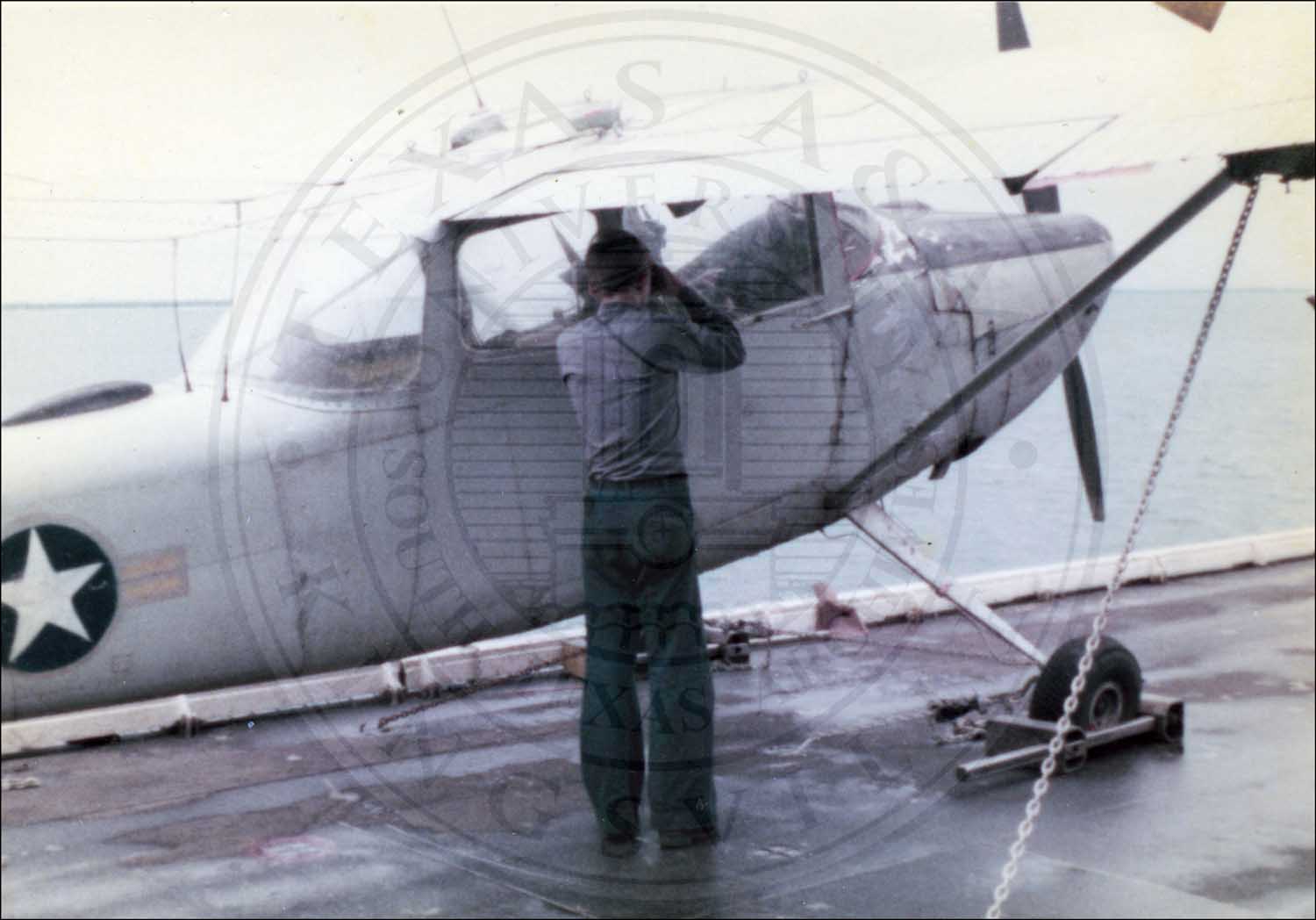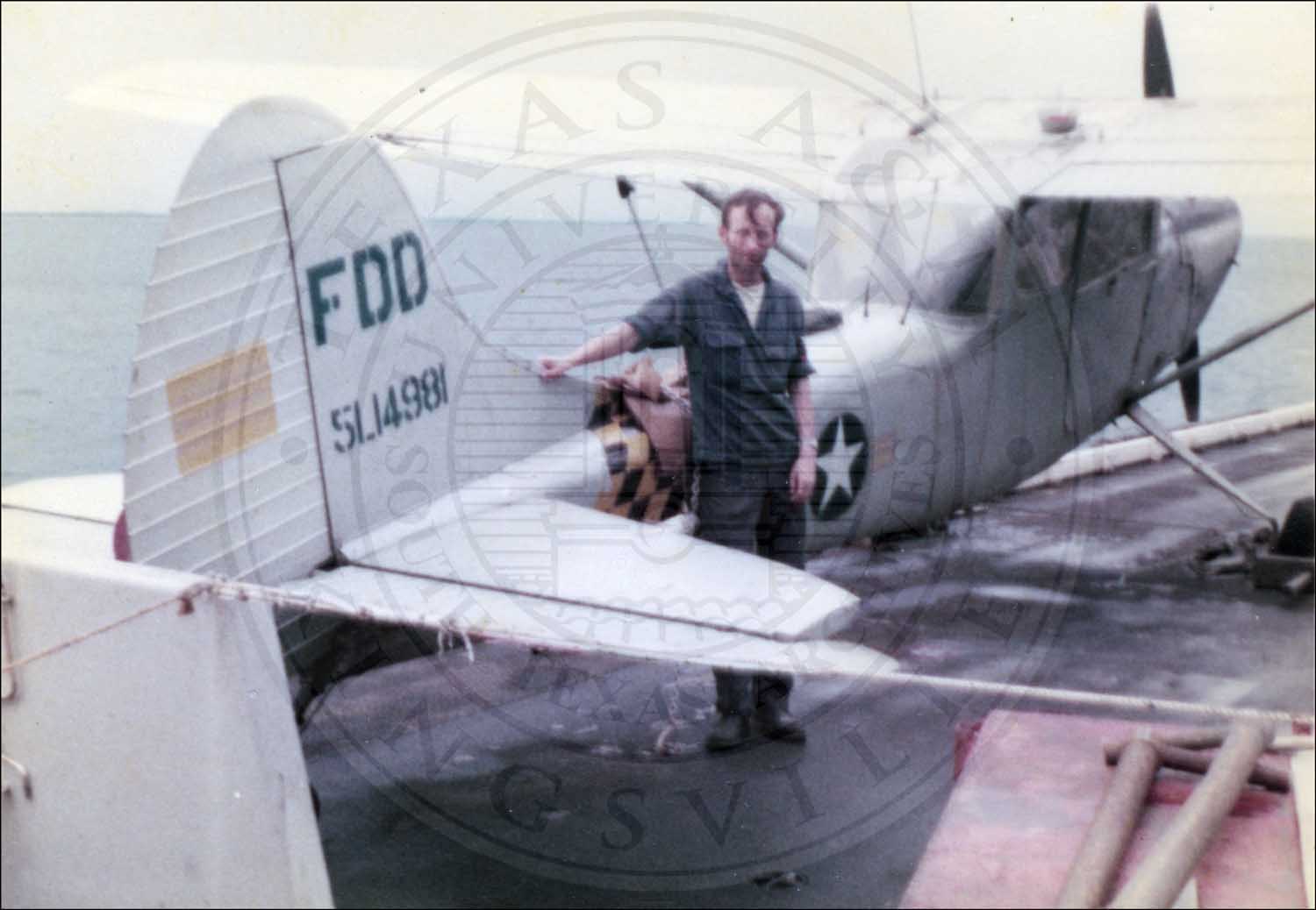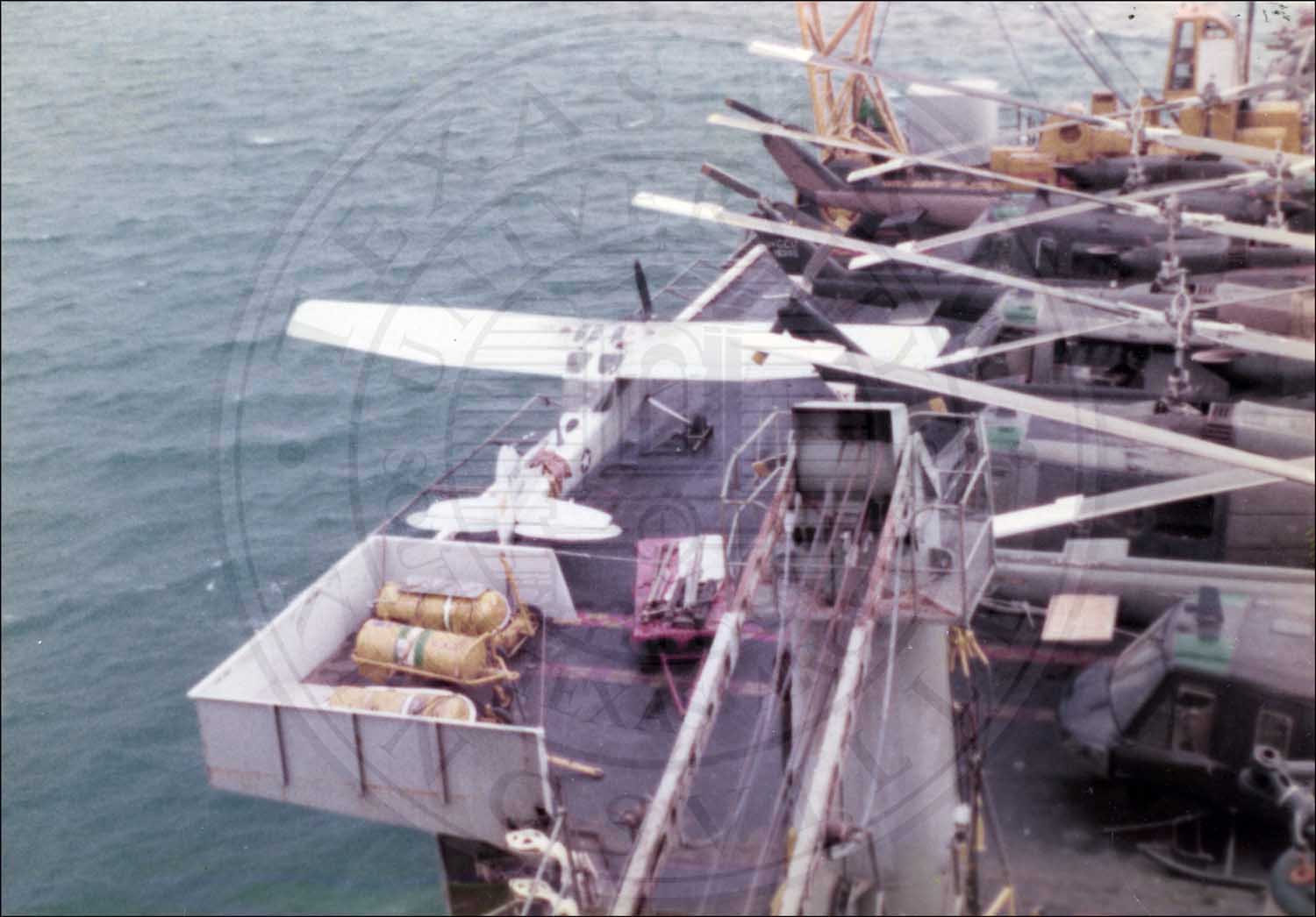 The Navy man standing here was a metal smith. Kenny didn't remember his name standing next to an OV-1 Birddog. The OV-1 brought an entire family of six. It almost crashed getting it to land on the U.S.S. Midway. The man flying it was a South Vietnamese and he flew the plane hoping he could find a place to land. |