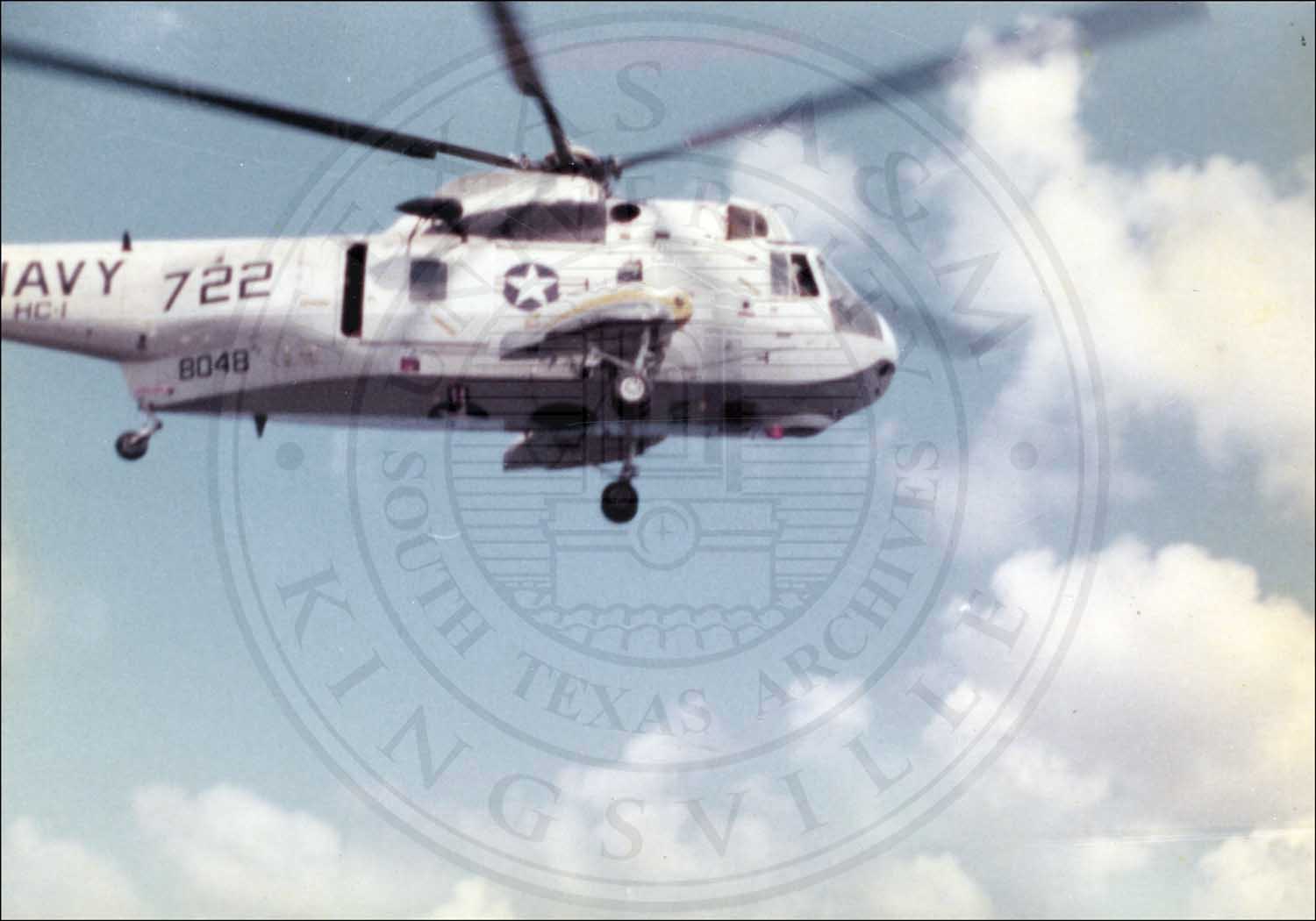 U.S. Navy helicopter lifting off from the deck of the U.S.S. Midway. They were meant for 2 to 3 people. It would pick up bodies from wrecked planes. |