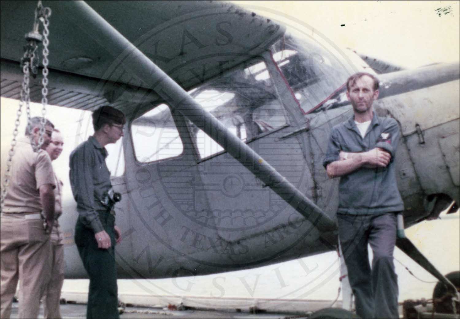 Russel Eugene Sampson standing next to an OV-1 Birddog. |