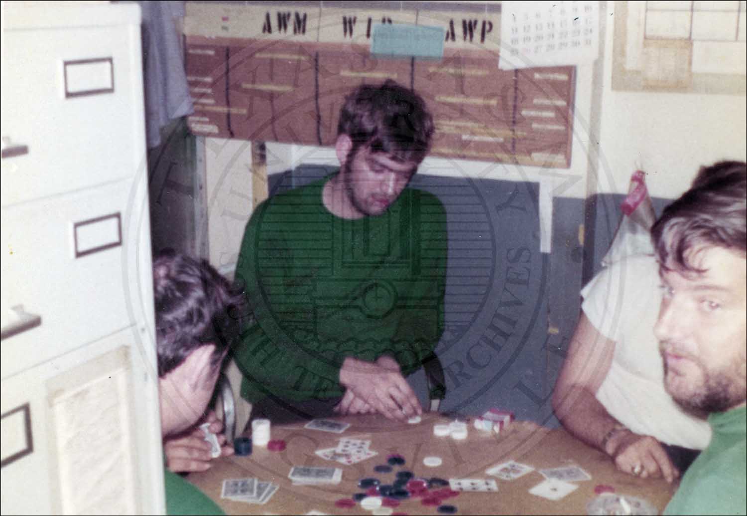 Four unidentified males playing poker inside of the U.S.S. Midway. |