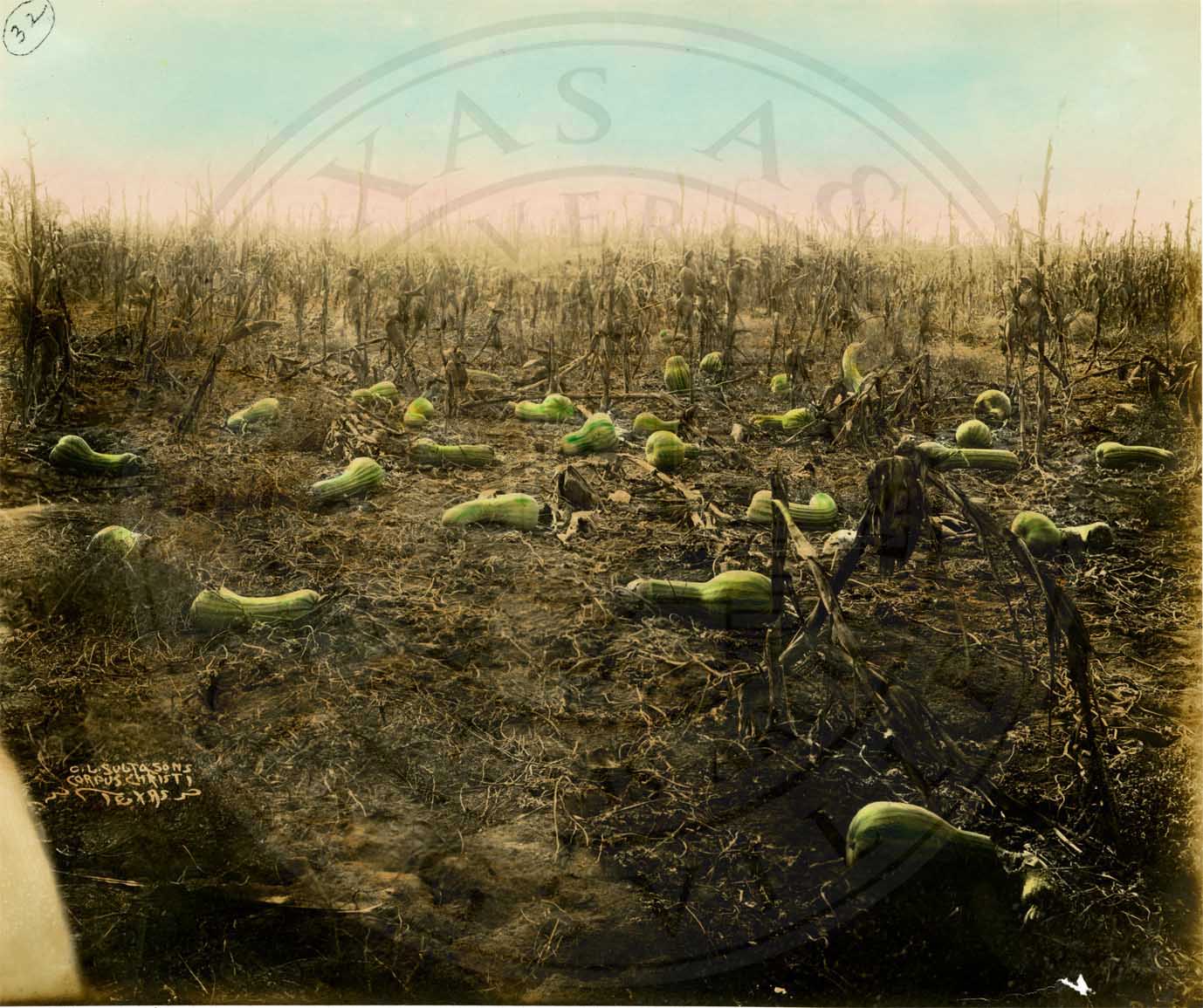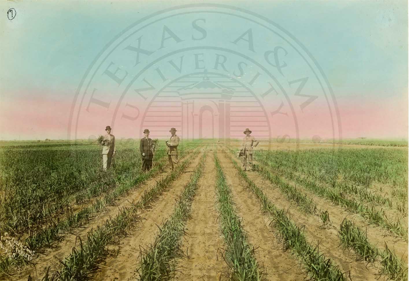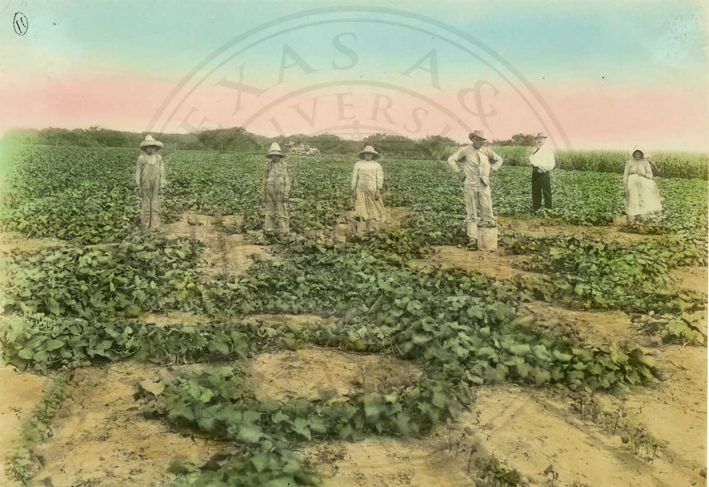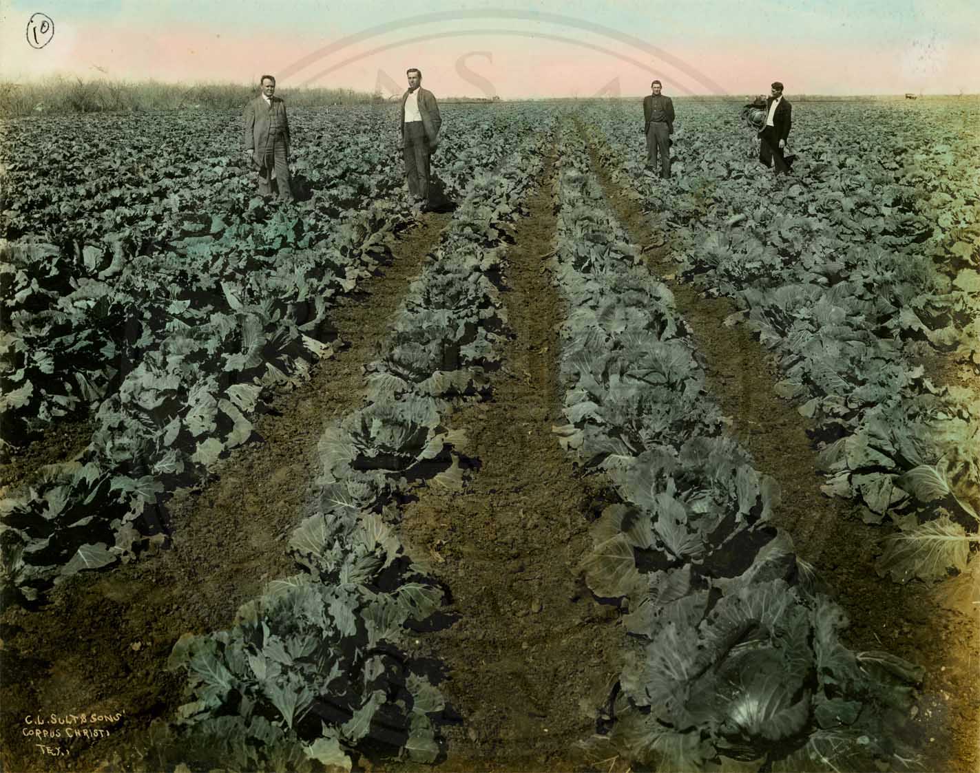 Patch of cabbages with four workers in the fields. The cabbage sold for $250 per acre. |