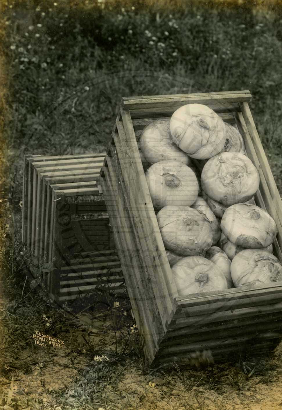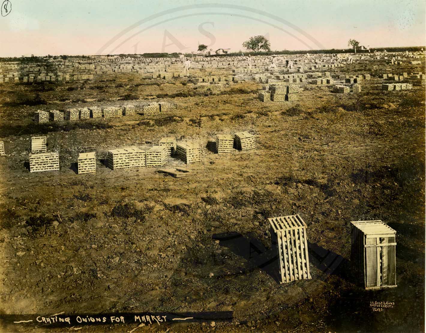 Crating onions for market in Nueces County. Onion boxes in the field. |