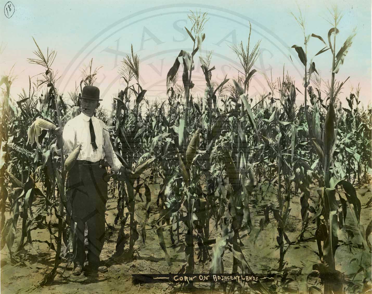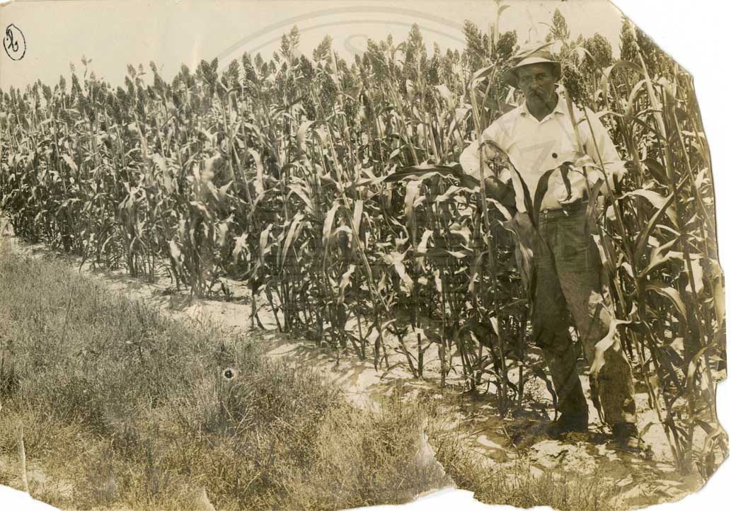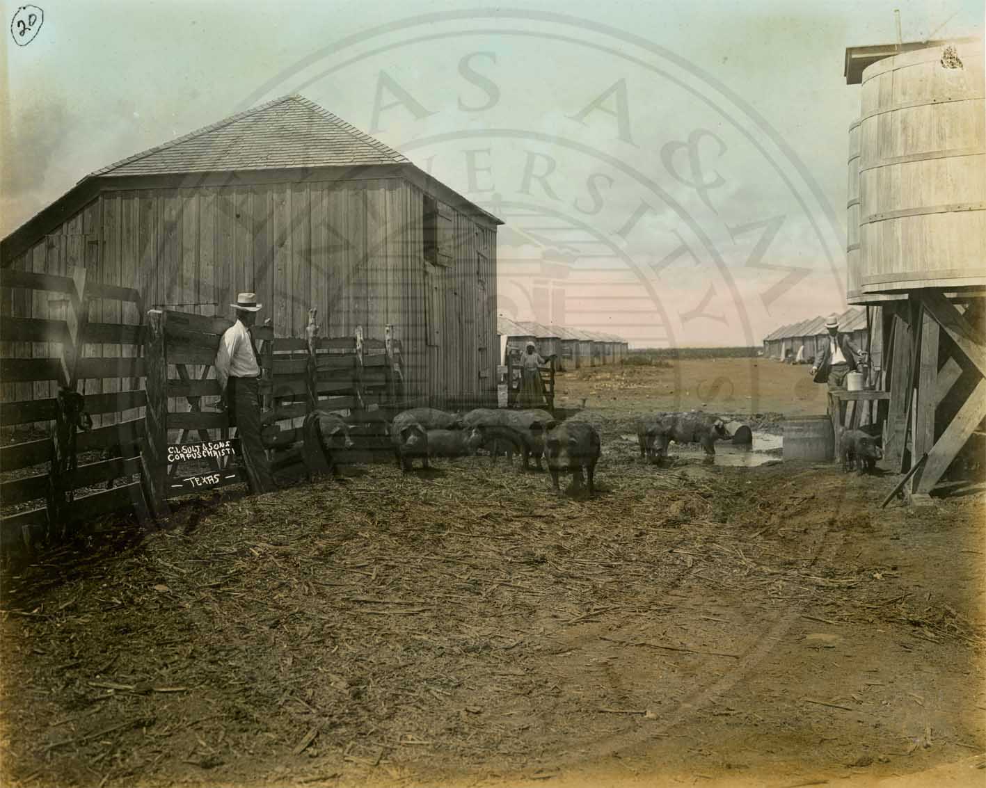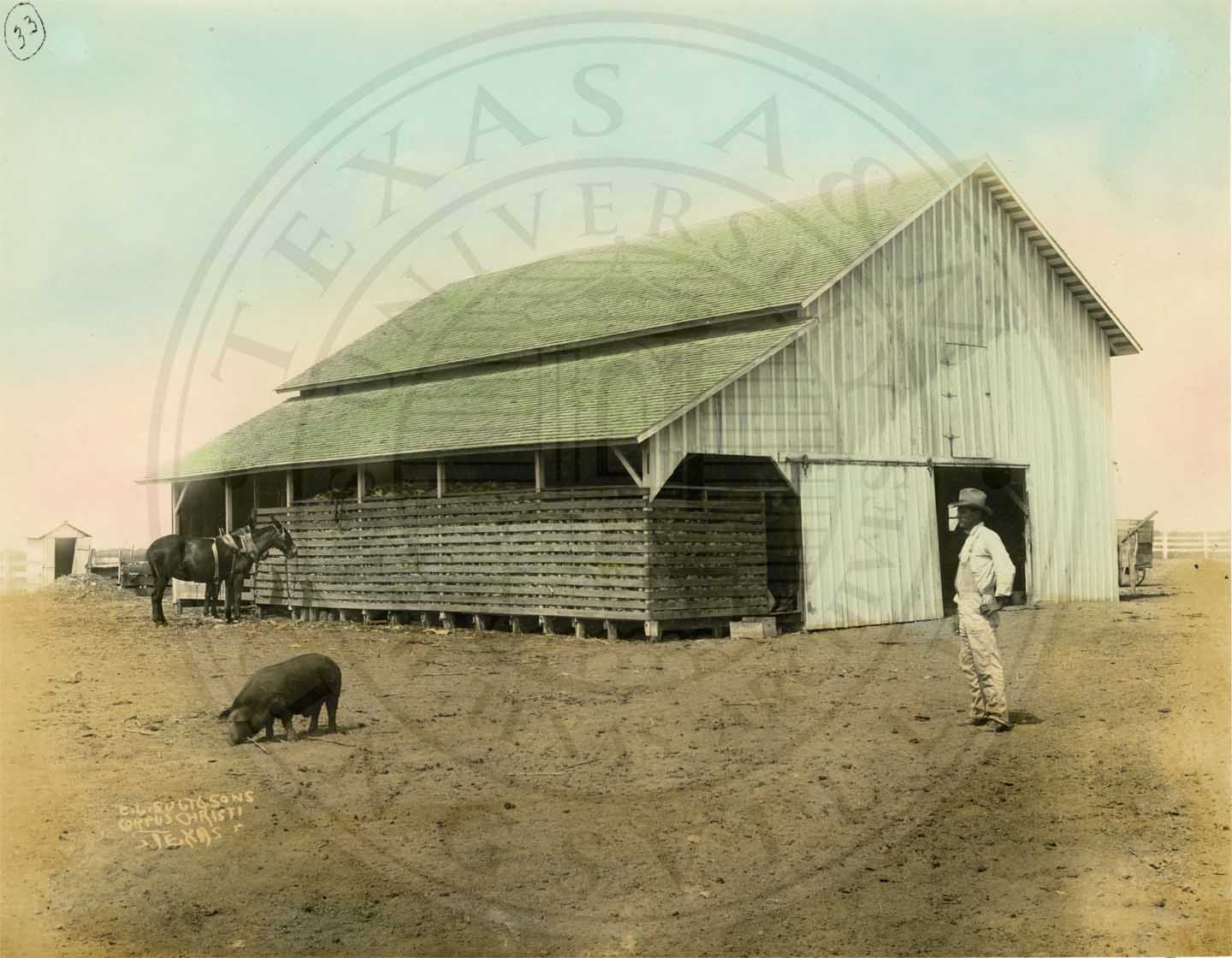 H.A. Shannon’s corn crib. Man and pig in the picture.