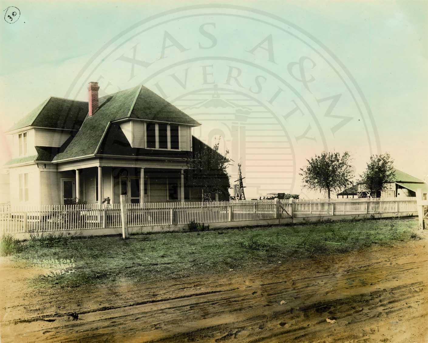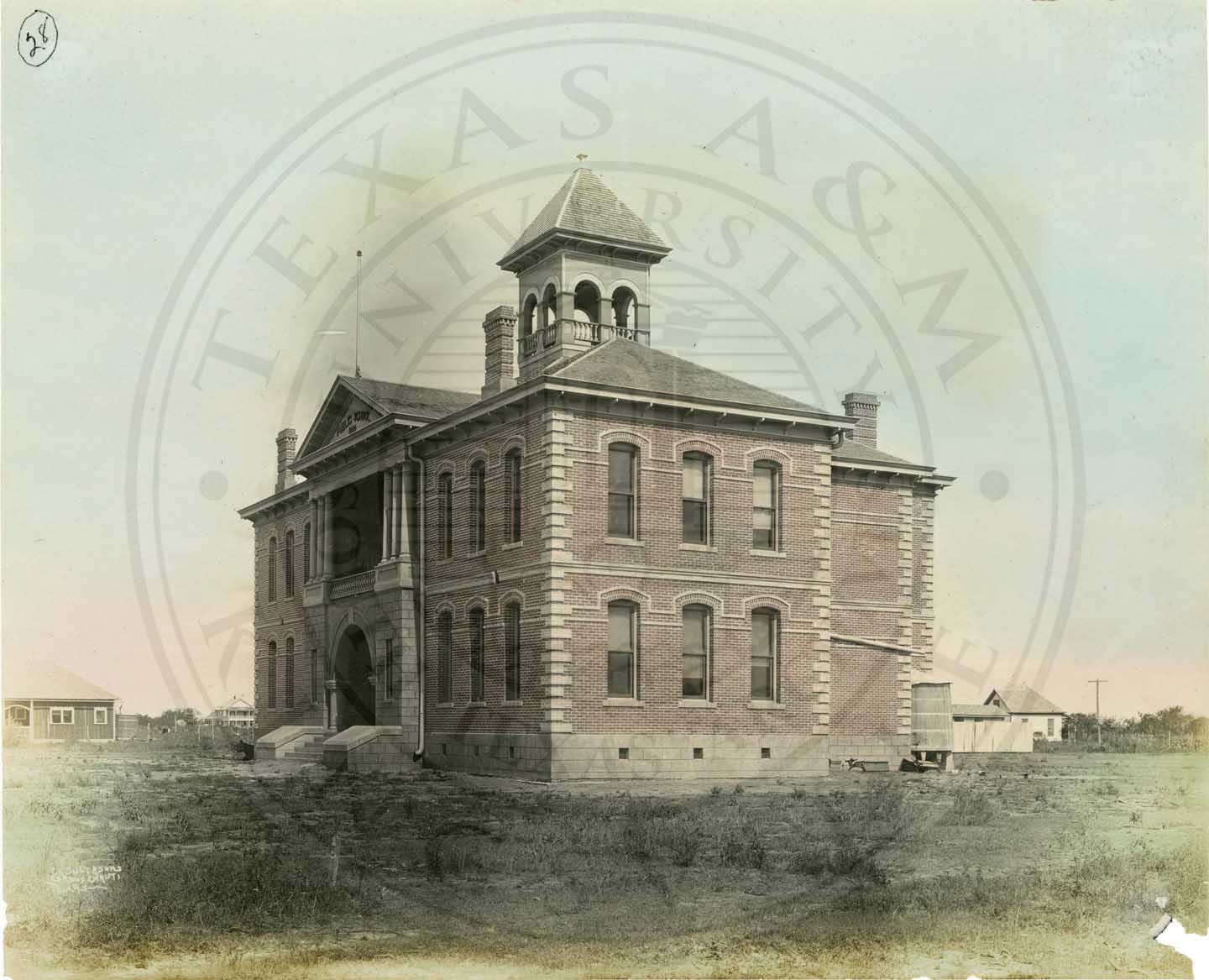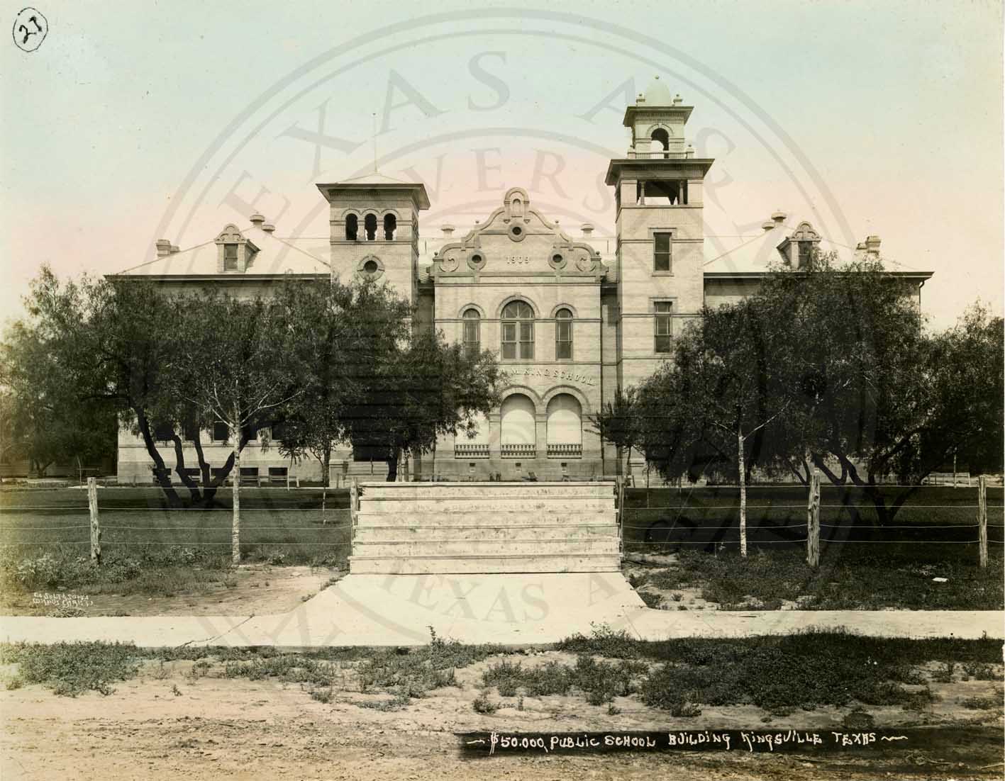 $50,000 public school building in Kingsville. School has fence surrounding it to keep out the cattle. Building donated by Mrs. King.
