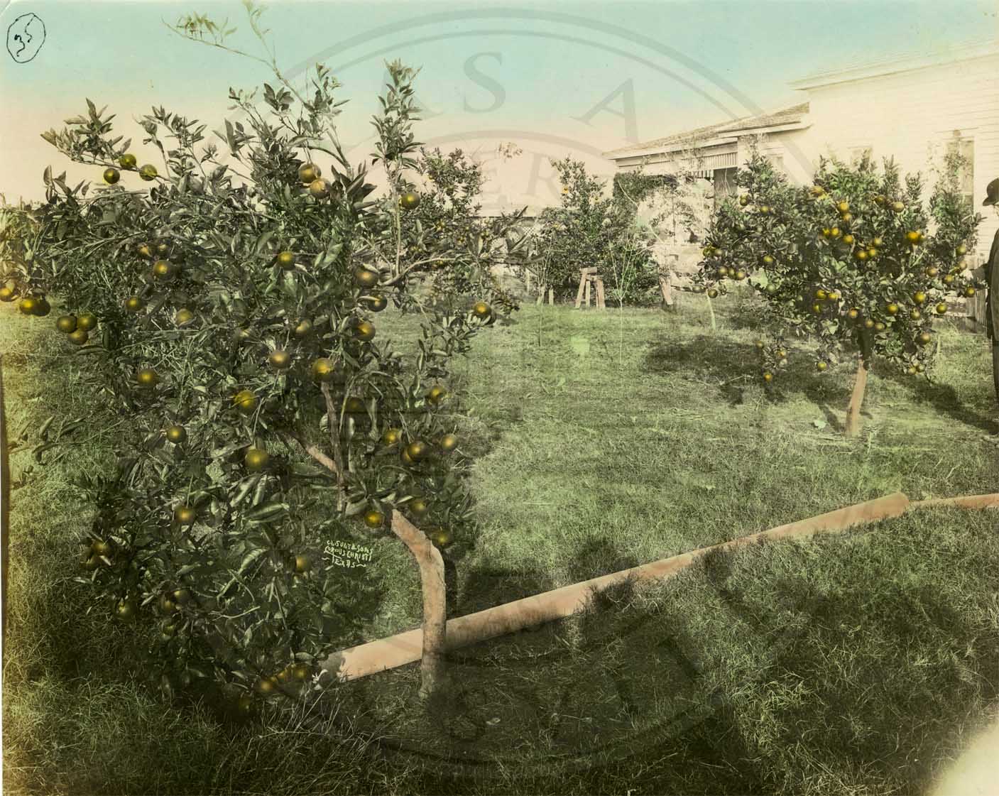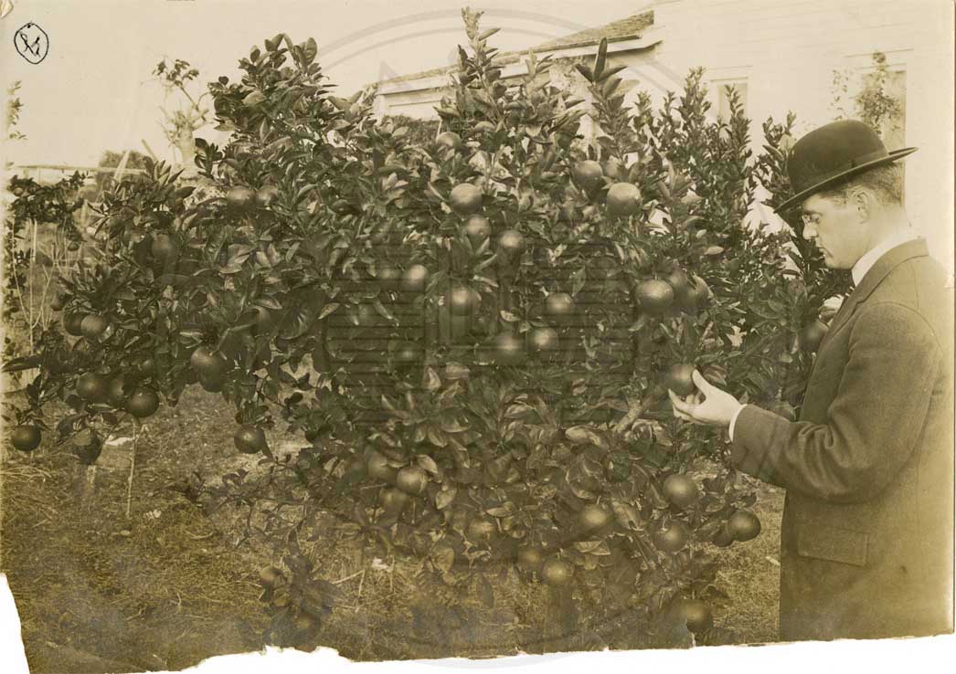 Citrus tree with man looking at orange. (Man is Charles Flato, Jr.). |