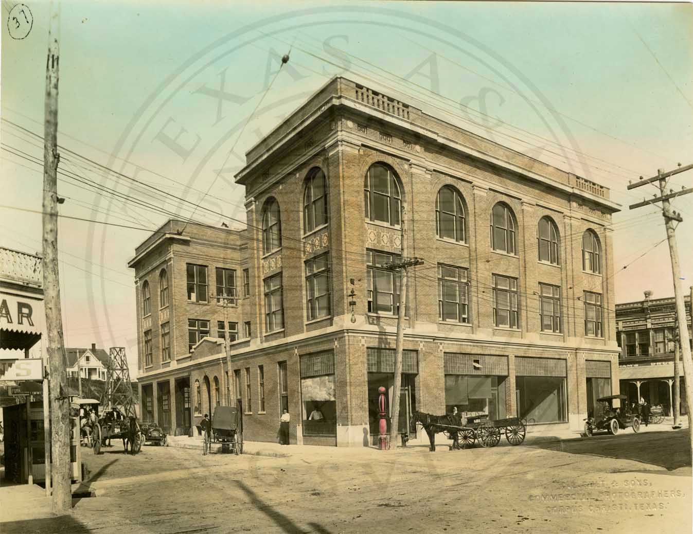 Large old building; barber pole, horse carts and Model T. Negative hold has handwritten description saying Original fire station in Corpus Christi, 1900-1910. Site of LaRetama Public Library.