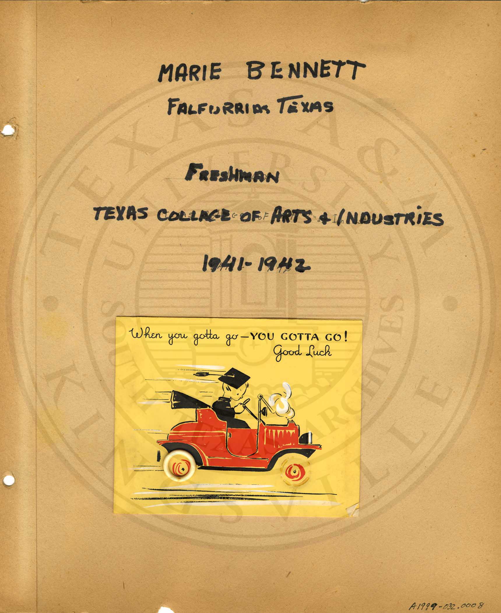 Scrapbook by Marie Bennett from Falfurrias, Texas during her freshman year at Texas College of Arts and Industries, 1941-1942. She enlisted in the Waves in 1942. |