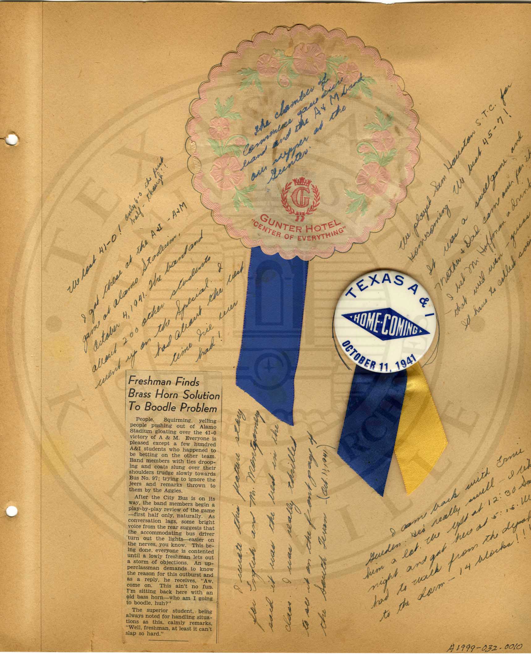Page 2 of scrapbook, Marie Bennett's scrapbook of her freshman year at Texas College of Arts and Industries,Home Coming, October 11, 1941 |