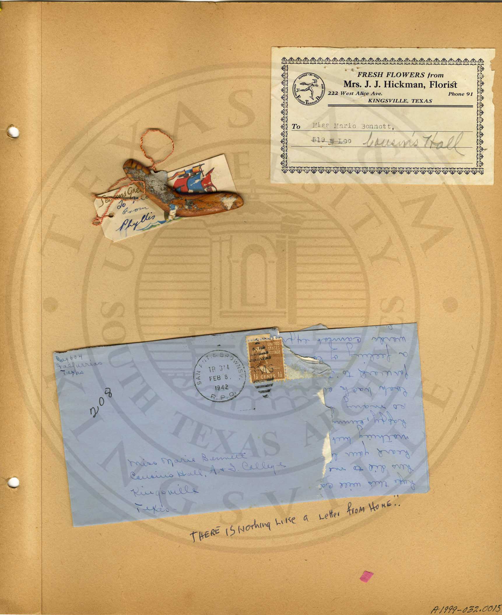 Page 7 of scrapbook, Marie Bennett's scrapbook of her freshman year at Texas College of Arts and Industries, letter from home. |