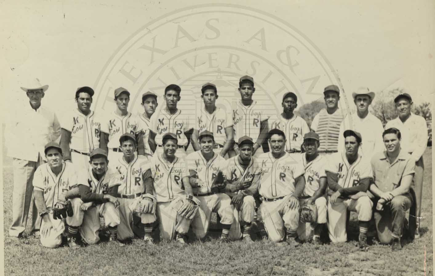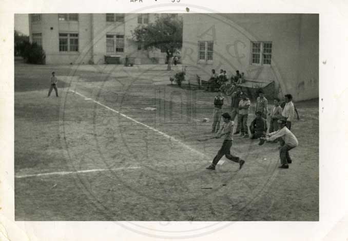 Neighborhood baseball game in April of 1955. It took place at Stephen F. Austin Elementary School next to La Carpa on Alice Street. It was the referred to as the Mexican Elementary due to segregation. Caption on back, "Austin School Raul G. Rosales Kingsville" |
