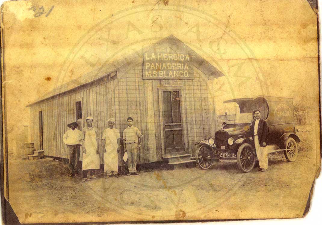 La Heroica Pandaderi, first Hispanic Bakery. 4 unidentied men on the left of the photo with Manul Suarez Blanco, grandfather, is standing next to the truck. |