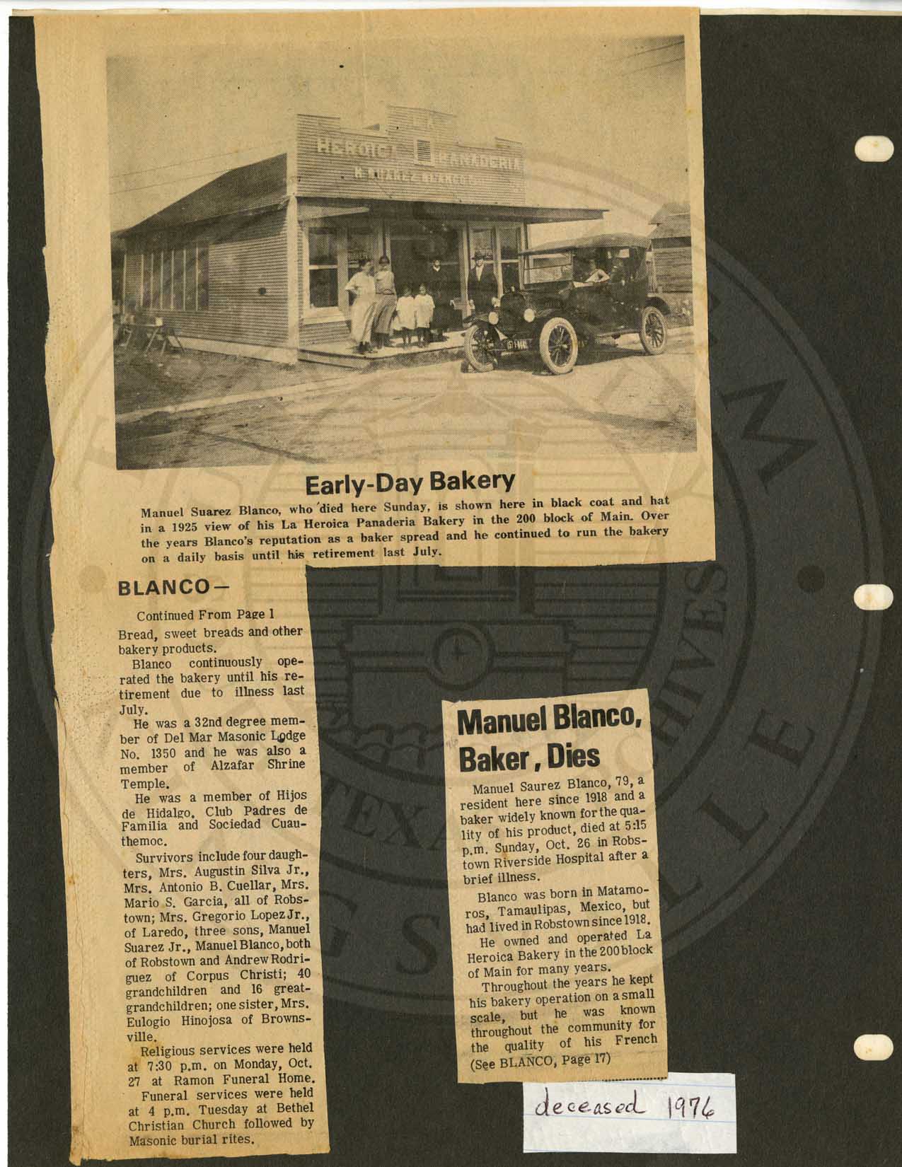 Robstown Record obiturary of Manuel Suarez Blanco. Picture is of his second bakery. |