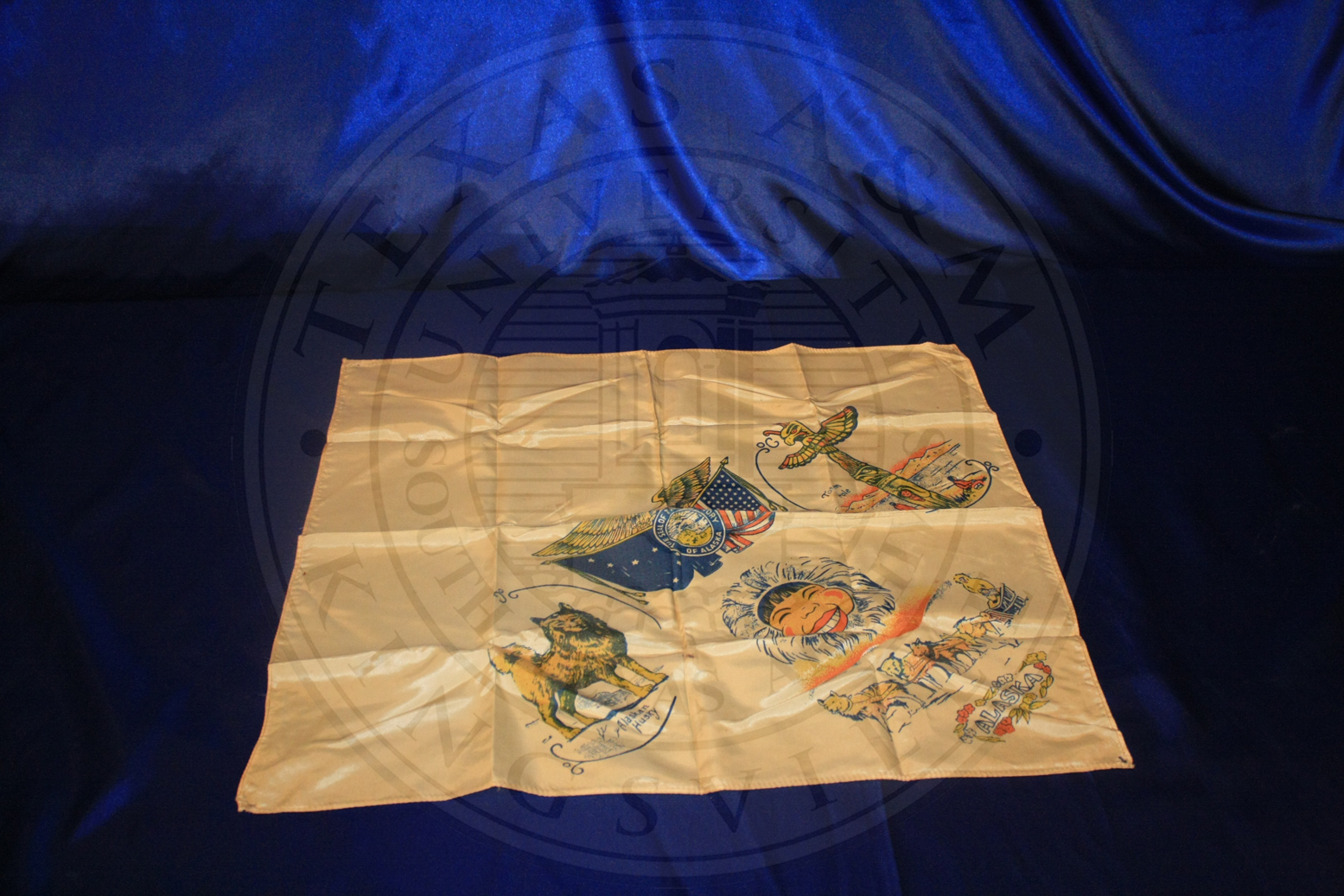 Artifact - scarf from Alaska, has pictures of an Eskimo, Totem Pole, dog sled, wolf, and the state seal |