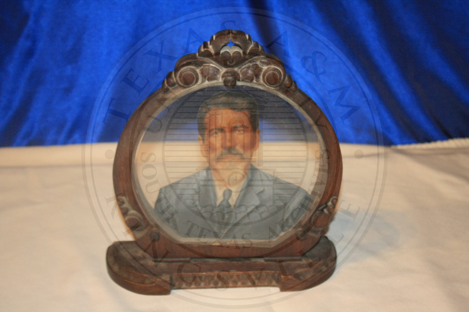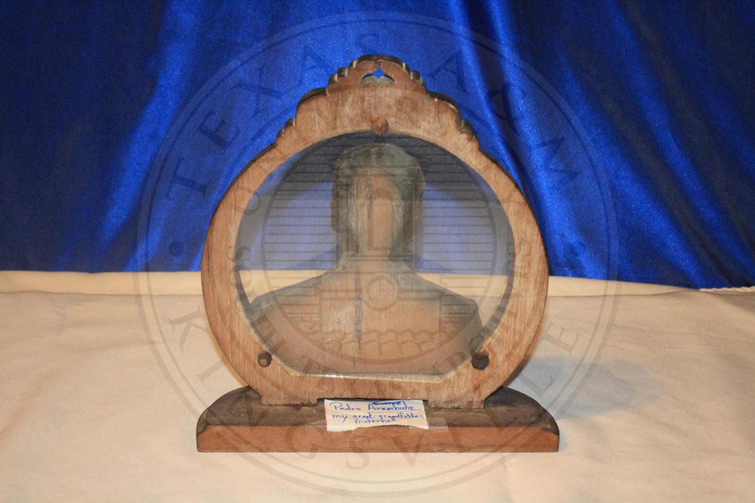 Artifact - Wooden colored cutout portrait in between two plates of glass. back view |