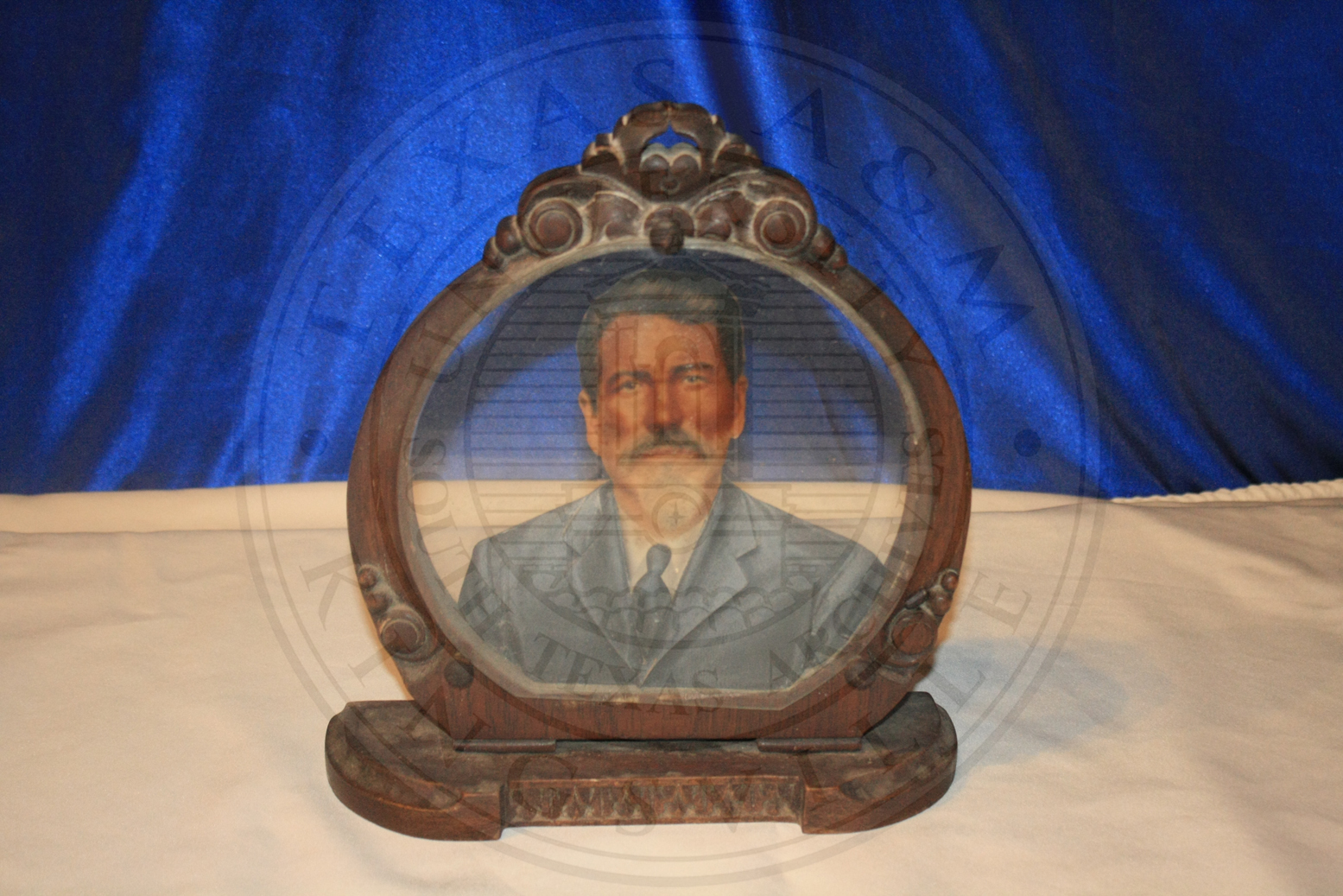 Artifact - Wooden colored cutout portrait in between two plates of glass. front view |