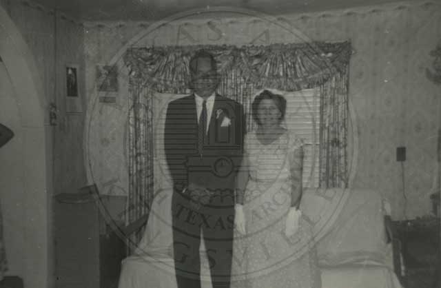Alvaro and Eva Flores on their wedding day June of 1955. They are in their home on E. Ella Strret in Kingsville |
