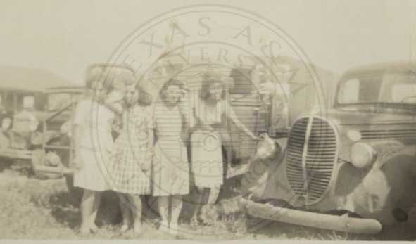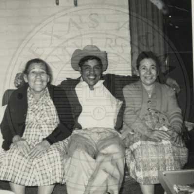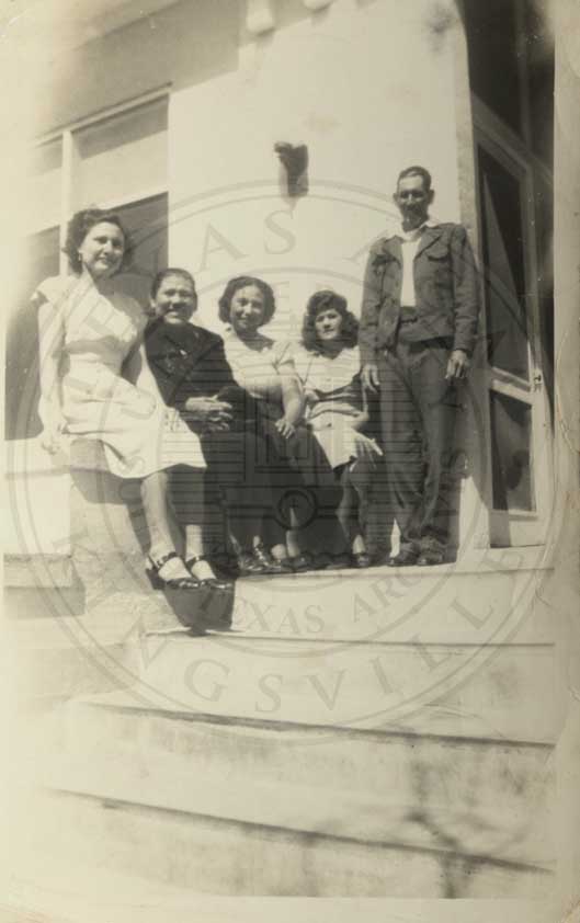 The Garcia Family at their home on King Ranch. From left to right: Eva Garcia, Eva's Mother, Virginia Garcia, unidentified, Samuel Garcia (Virginia's husband.) |