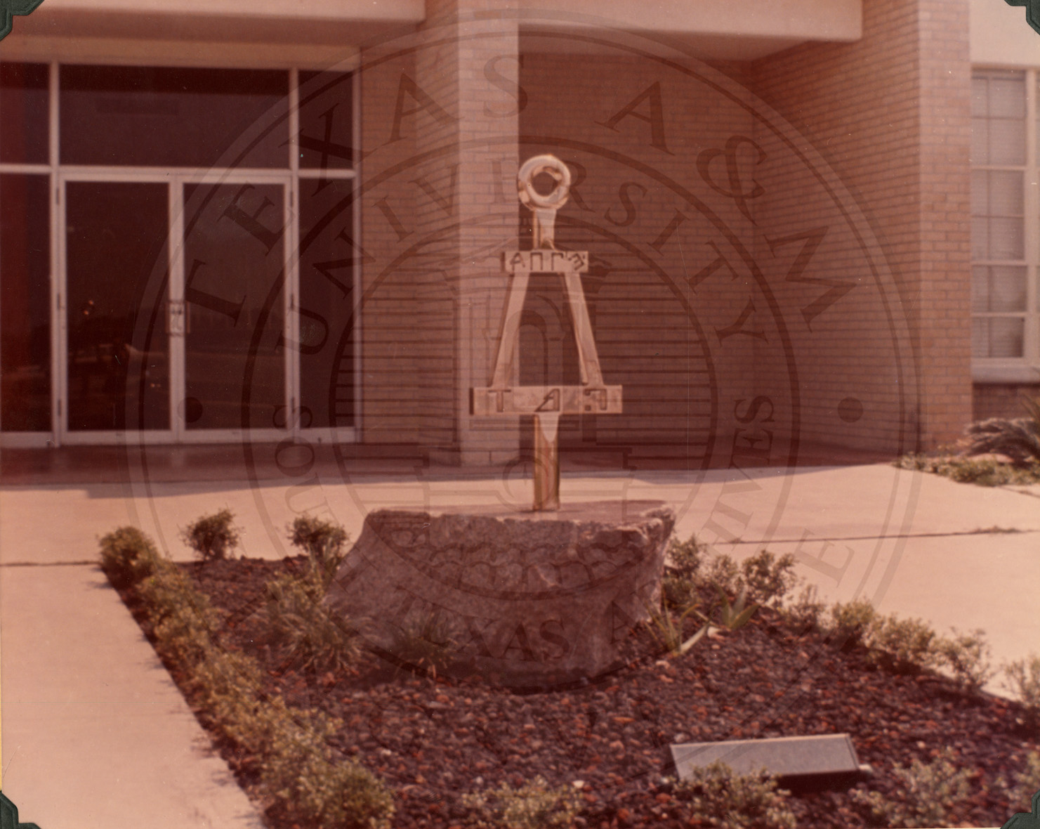 Dr. Dan Turner, Tau Beta Pi advisor speaking at podium during BENT dedication. Sitting (L-R) Dr. Ernest Frank, Dean of Engineering, Dr. Gerald Robins, President Texas A&I University, Walter Byrne, President of student chapter of Tau Beta Pi, Bob (Forbus?) - CPL, Texas A&I alumni, ΣT (Sigma Tau?) Member, Mr. William R. Nagel, secretary Tau Beta Pi, Speaker is framed through the Tau Beta Pi crest. Page three of scrapbook