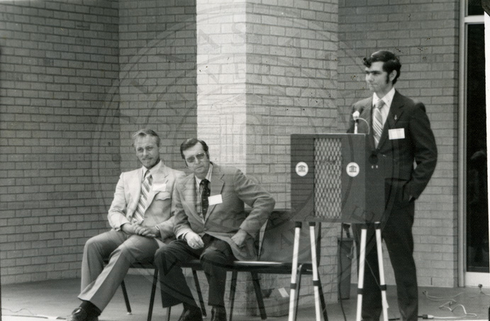 (L-R) Dr. Ernest Frank, Dean of Engineering, Dr. Gerald Robins, President TAMUK, Walter Byrne, President of student chapter of Tau Beta Pi speaking during BENT dedication. Page 5 of scrapbook |