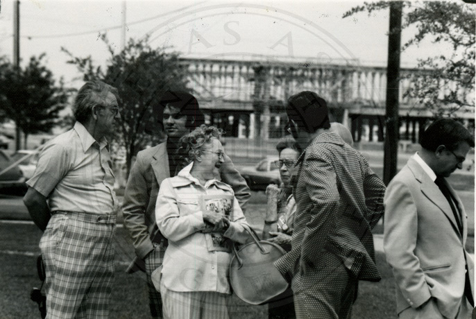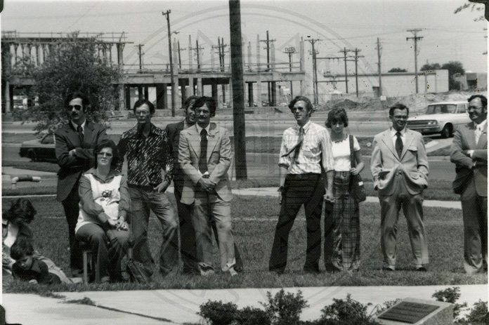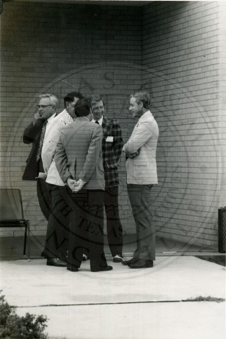 Dr. Ernest Frank, Dr. Gerald Robins, Bob Forbus, Dr. Dan Turner, and Mr. William R. Nagel standing in a circle. Page 8 of scrapbook |