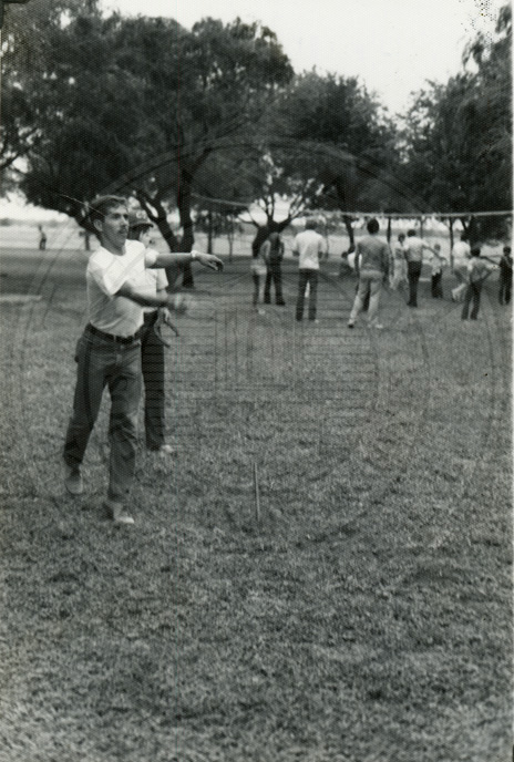 Unknown man playing Horse Shoes at a Celanese BBQ. Page 10 of scrapbook |
