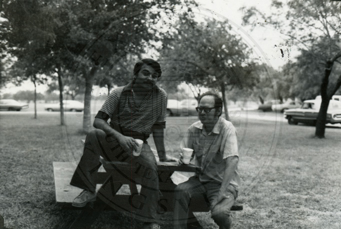 Dr. Ernest Frank, Dr. Gerald Robins, Bob Forbus, Dr. Dan Turner, and standing in a circle. Page 8 of scrapbook. Page 8 of scrapbook |