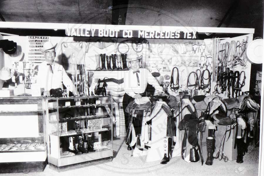 A1989-050.0001Collection: Valley Boot Company Photographs Location: Negative File | Valley Boot Co., Mercedes, Texas on sign in interior of shop. Two men with a counter of wares & saddles. (LS #260-61 in pencil on back.).