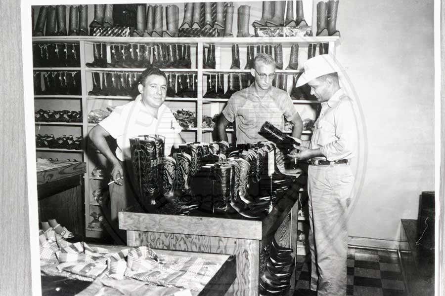 A1989-050.0006Collection: Valley Boot Company Photographs Location: Negative File | Three men inside Valley Boot Co., (black and white parkay floor) Mercedes, TX |  |