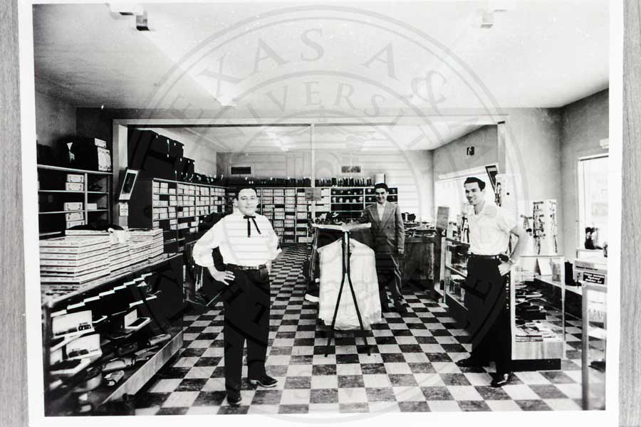 A1989-050.0005Collection: Valley Boot Company Photographs Location: Negative File | Three men inside Valley Boot Co., (black and white parkay floor) Mercedes, Texas
