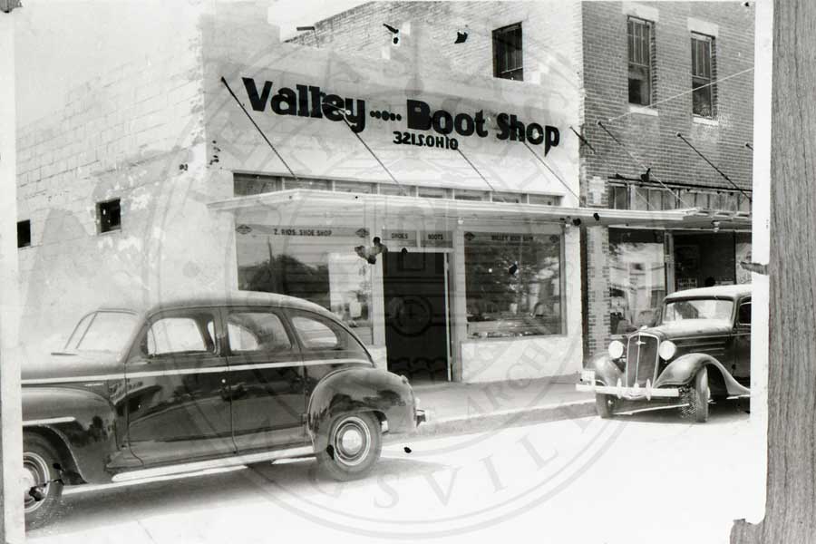 A1989-050.0007Collection: Valley Boot Company Photographs Location: Negative File | Front of Valley Boot Shop, "321 S. Ohio"  "Z. Rios Shoe Shop" printed on signs |  |