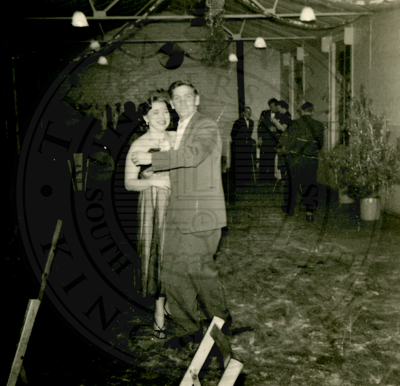 New Years Eve. Unidentified couple dancing. Other dancers are seen in the background. There is confetti and streamers on the floor |