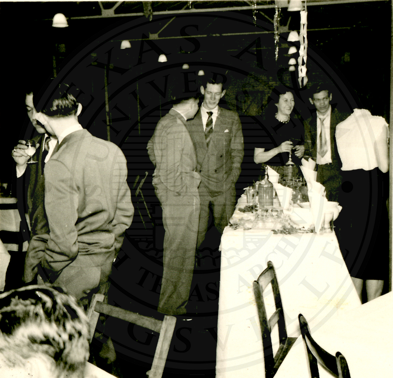 New Years Eve. Two (L-R) different sets of unidentified men are talking. The set on the right is standing next to another group of unidentified women and a man |