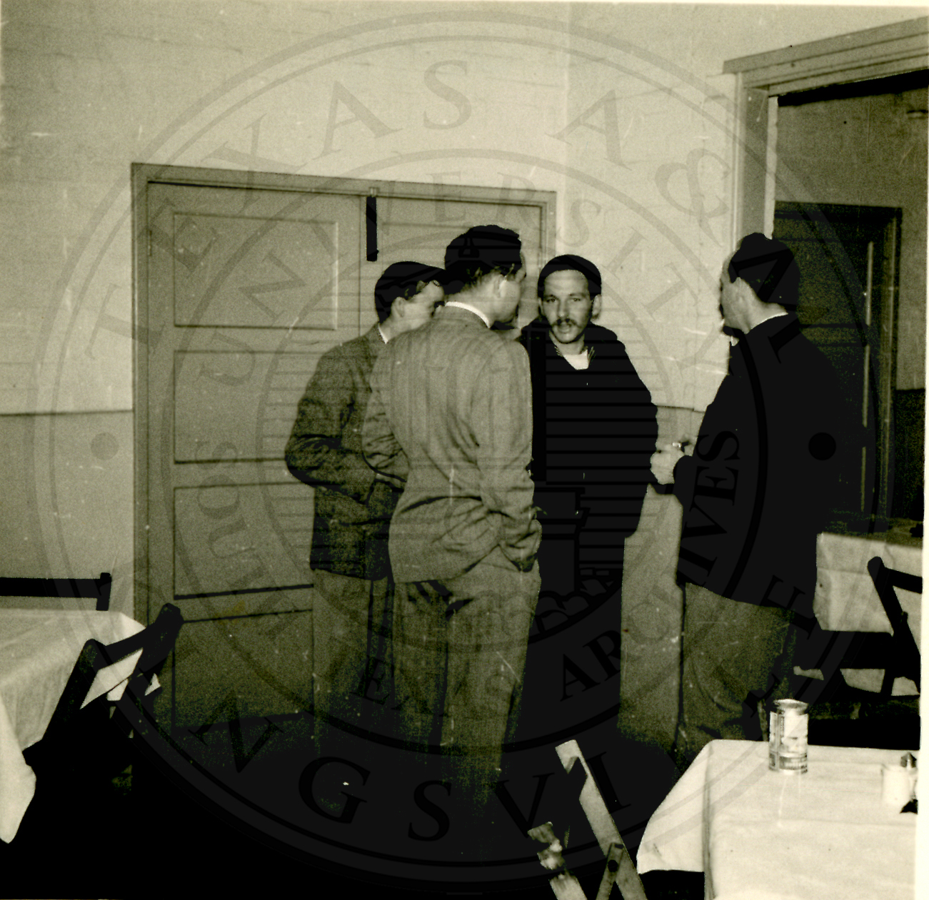 New Years Eve. Four unidentified men standing in a semi-circle talking with the man on the left has his back to the camera |