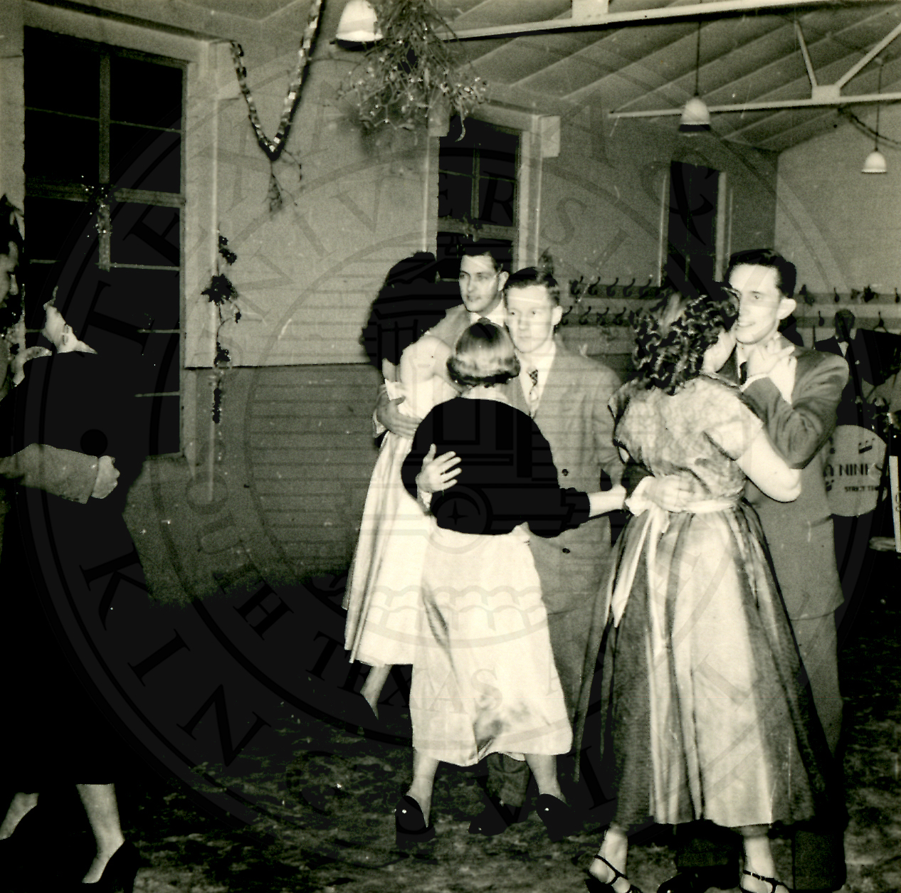 New Years Eve. Four unidentified couples are dancing. There is confetti and streamers on the floor |