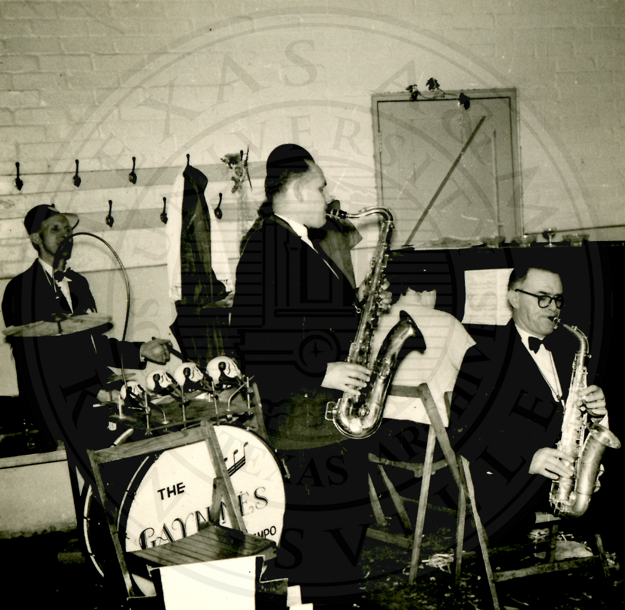 New Years Eve. Unidentified band is playing, the bands name can be seen on the bass drum but not read |