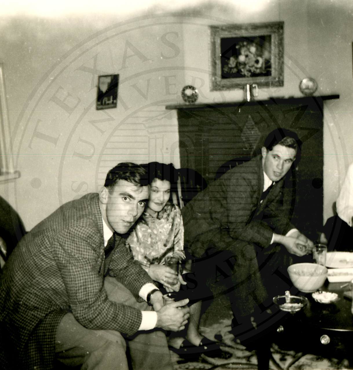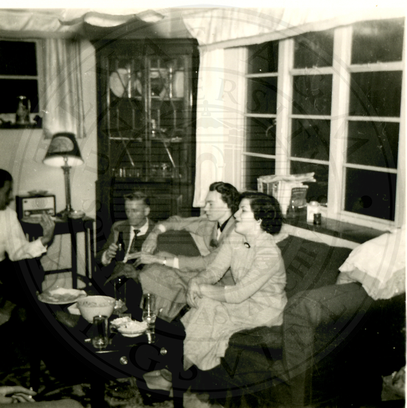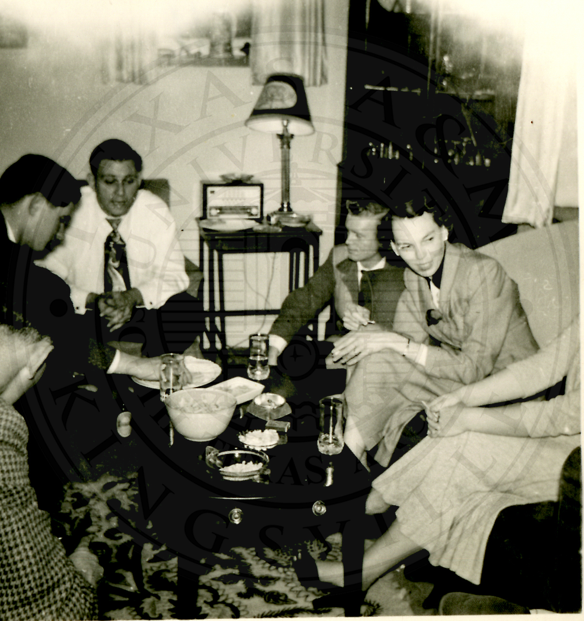 Al Eakin Birthday party. Two unidentified woman on the right are sitting on a couch with an unidentified man kneeling/seated next to them off of the couch. Three more unidentified men are seated on chairs. A coffee table is between the couch and chairs |